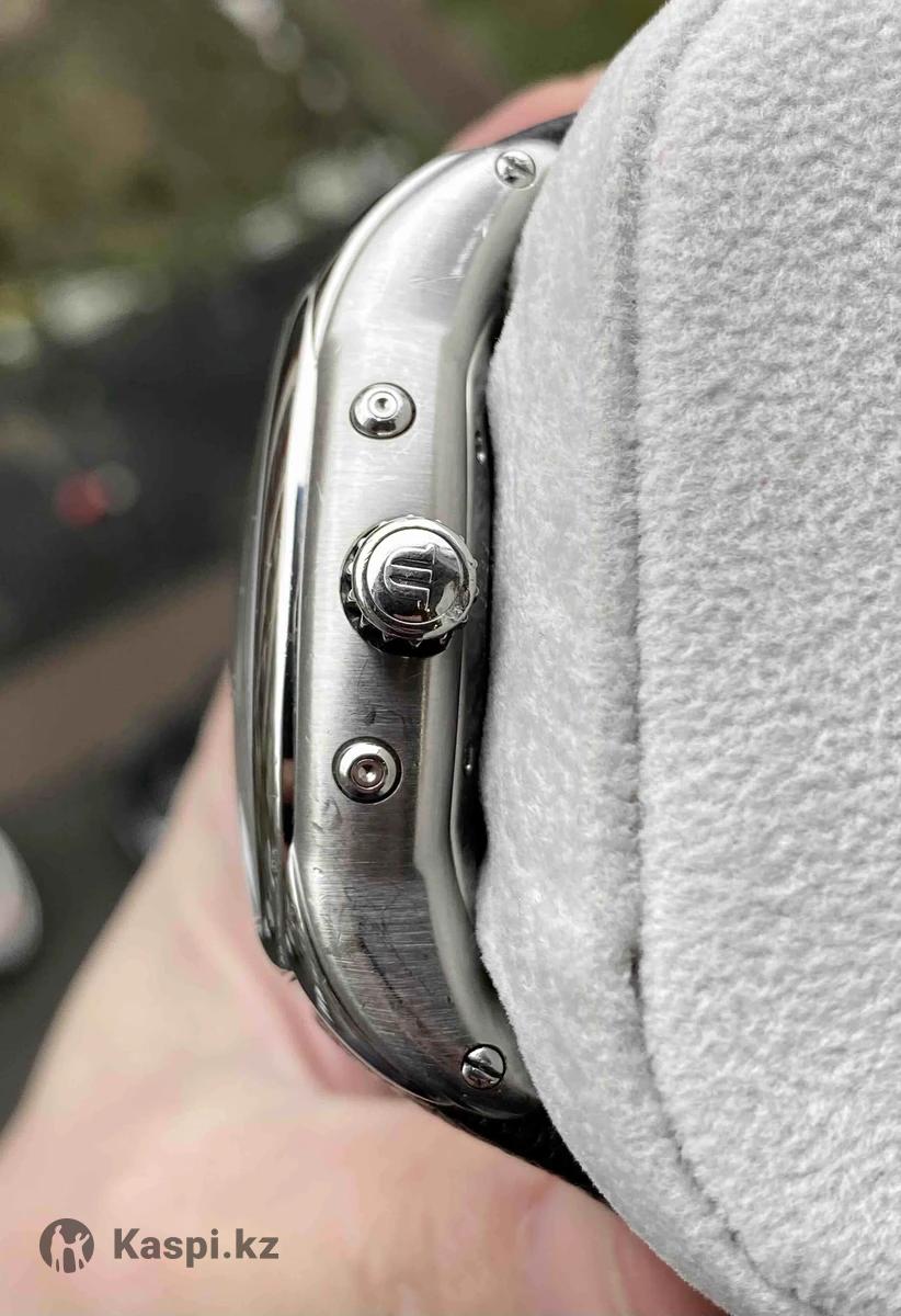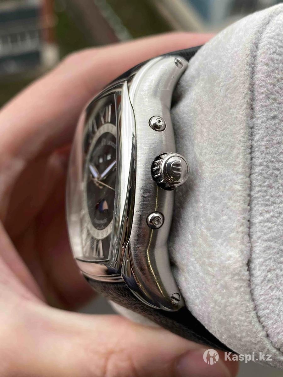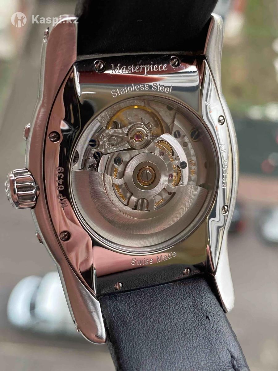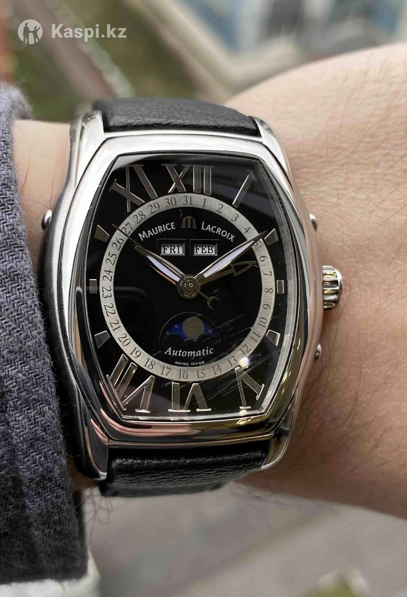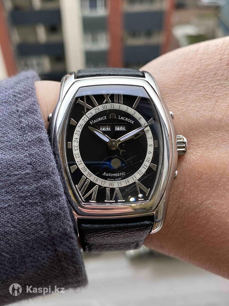 Мужские часы Maurice Lacroix Masterpiece Phase de Lune Tonneau MP6439-SS001-31E Пол: Мужские Бренд: Maurice Lacroix Коллекция: Moon Phase Tonneau Ref: MP6439-SS001-31E Тип механизма: механический с автоподзаводом Калибр: ML37 / ETA 2824-2 Запас хода 40часов Материал корпуса: Нержавеющая сталь Размер корпуса: 39х41,5мм Функции: месяц, число, день недели, фазы Луны, специальная стрелка указывает дату Стрелки с люминесцентным покрытием Браслет: кожаный ремешок, расстояние между дужками 21 мм Форма корпуса: Нестандартной формы Стекло: Сапфир с царапинами Циферблат: черный, циферблат покрыт серебром 925 пробы. Маркеры циферблата: Римские цифры Водонепроницаемость: 50м Производство: Швейцария Retail price $6600 цена окончательная