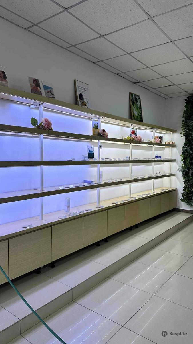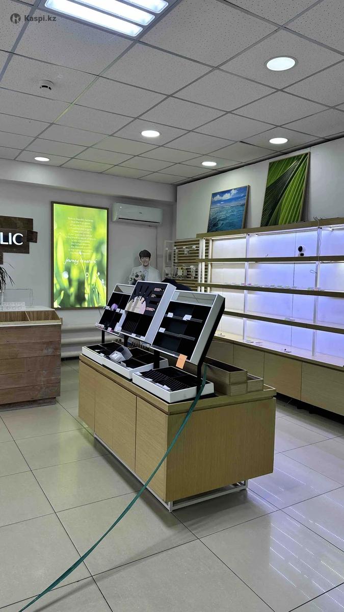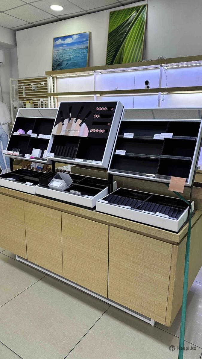 Готовая мебель для магазина косметики: стеллажи, островок, кассовая зона, оборудование (моноблок, сканер для штрихкодов, мышь, клавиатура, принтер чеков), картины, ценникодержатели