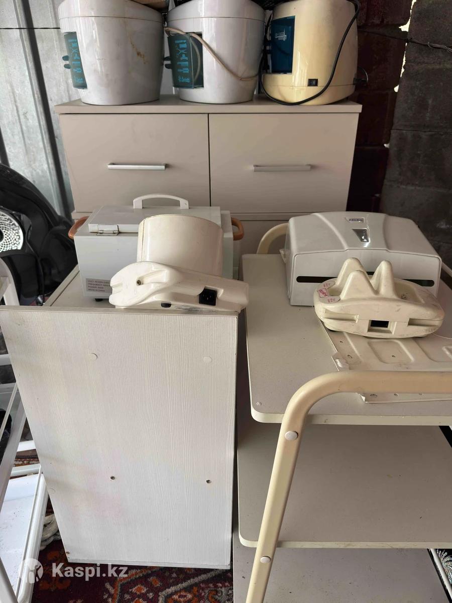 В связи с закрытием салона красоты , продается оборудование хорошего качества. На фото все рабочее , на пыль не обращайте внимания ,они застоялись на улице. При желании можно отмыть до идеального состояния. За всё сумма 200,000 тг ☑️В наличии 4 ультрафиолетовых стерилизаторов для парикмахерских инструментов (цена за один аппарат 3000тг) ☑️Комод 3 секции в высоту 2 в ширину новый цена 20,000тг Воскоплав и салфетницу подарю одному из первых покупателей ☑️застекленная тележка помощница 7000тг ☑️полка на колесах 5000тг ☑️тумба 3000тг ☑️стерилизатор для ногтевых инструментов 3000тг ☑️3 зеркала с подстановкой по 5000тг за один ☑️Мощные стабилизатор электричества 40,000тг за один (На каспи новый 115,000тг) можете посмотреть ☑️3000тг подставка для парикмахера. ☑️2 маникюрных стола по 10,000тг/1 ☑️Цена 35000тг Климазон — профессиональное оборудование для салонов красоты. Назначение: Используется для ускорения процессов окрашивания, химической завивки и лечебных процедур для волос. Принцип работы: В отличие от обычных сушуаров, климазоны использует инфракрасное излучение, которое воздействует непосредственно на волосы и наносимые средства, обеспечивая более глубокое и быстрое проникновение. Преимущества: Повышает эффективность окрашивания, делает цветовой пигмент интенсивнее и устойчивее, а также значительно экономит время процедуры.