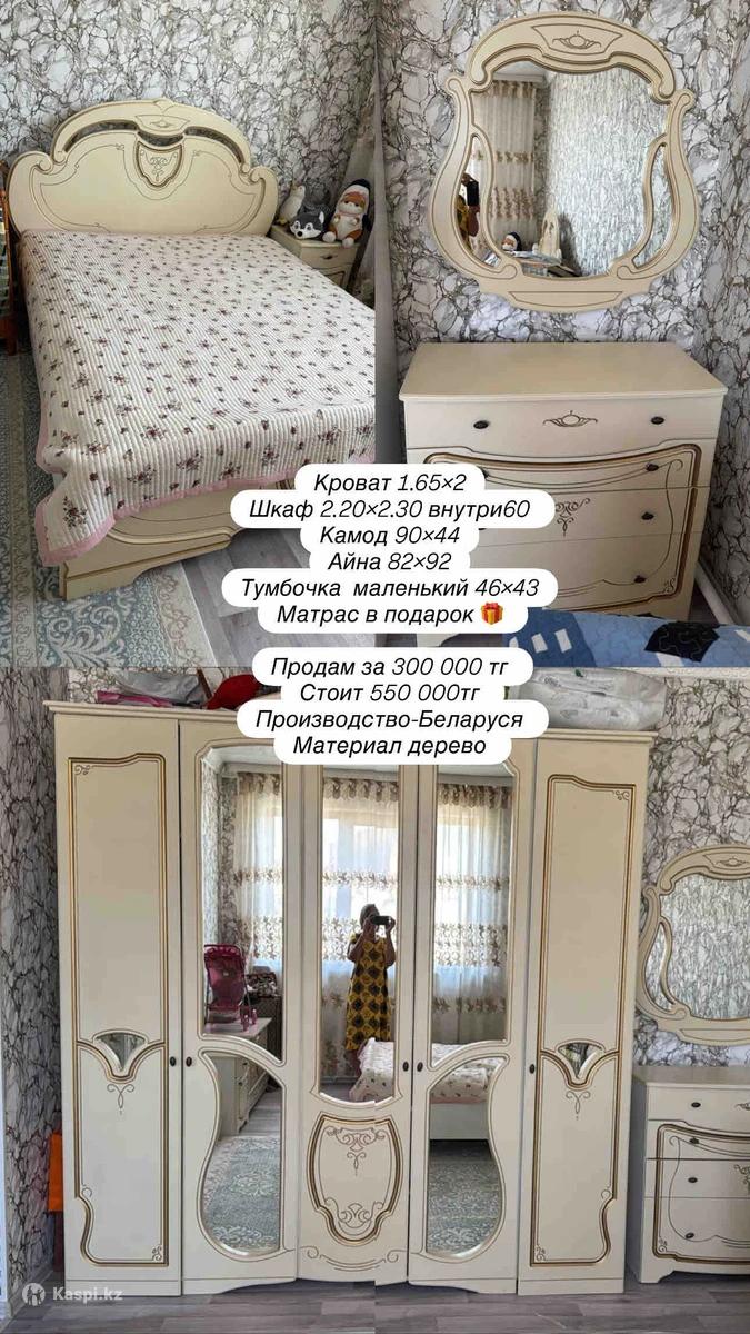 Кровать 1.65×2.00 Шифоньер 2.20×2.30 внутри 60 Комод 90×44 Зеркало 82×92 Тумбочка 46×43 Производство Белоруссия Материал дерево, МДФ Купила за 550 000тг Продам за 300 000тг Матрас в подарок 🎁 Ортопедический 6д набор