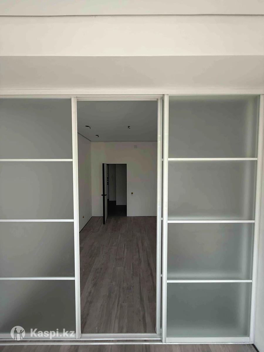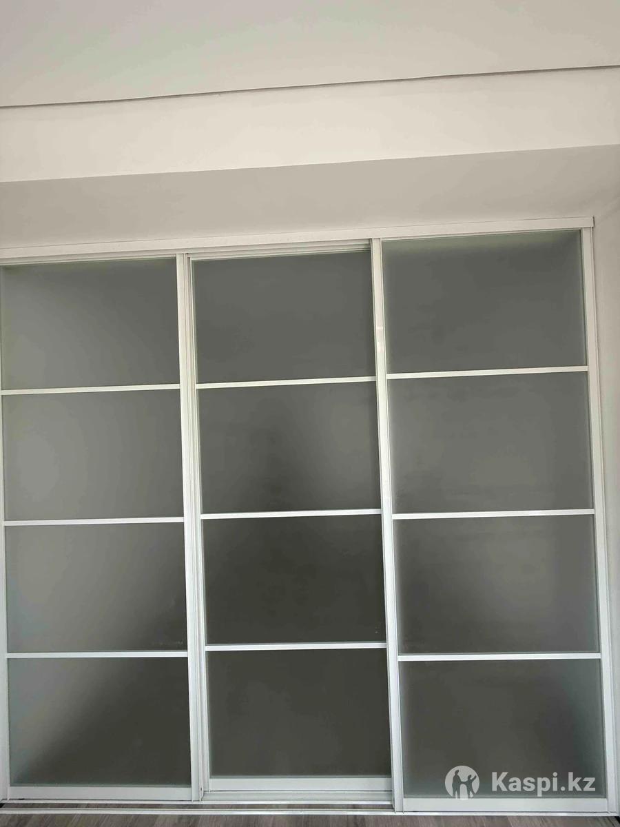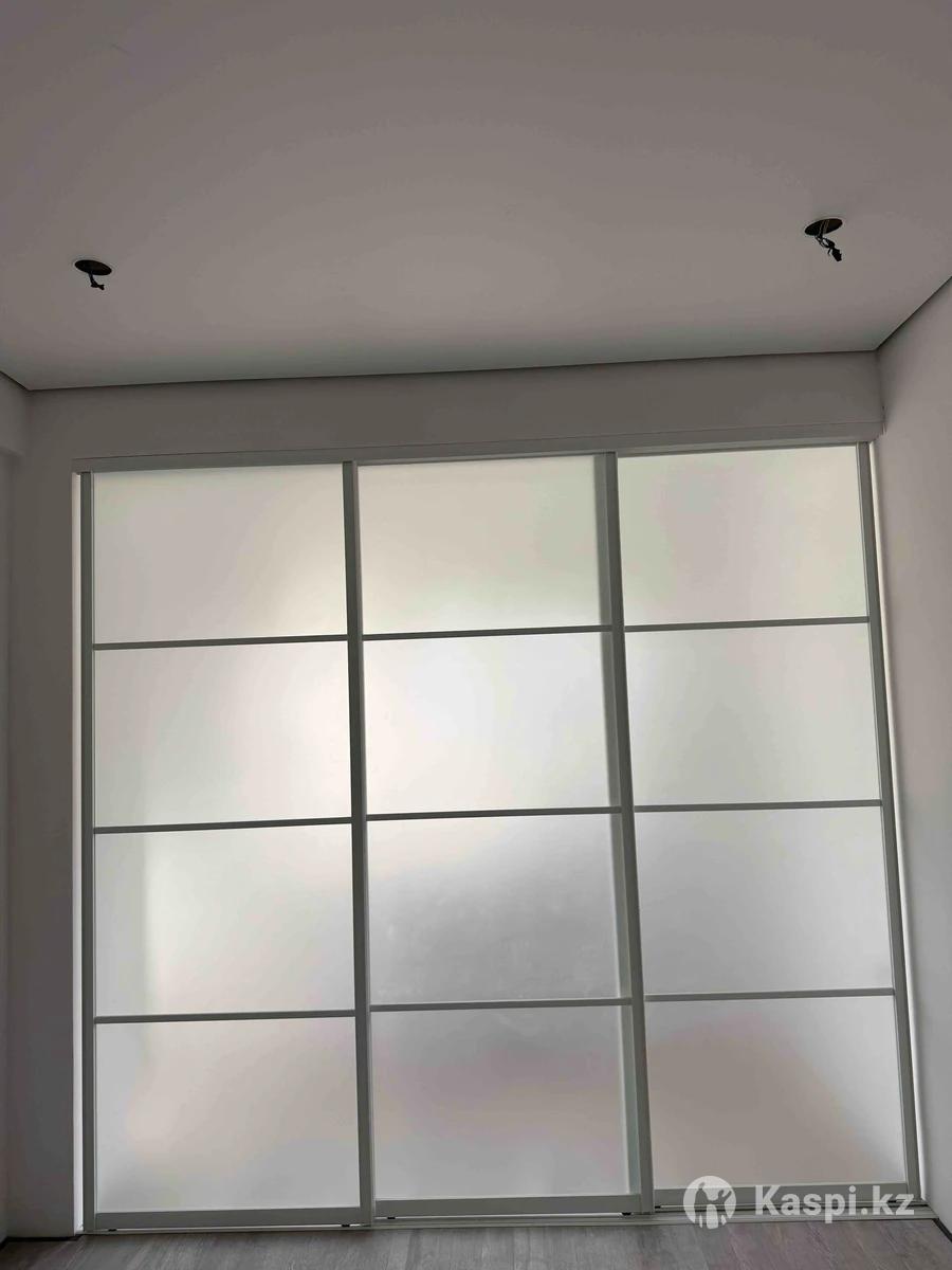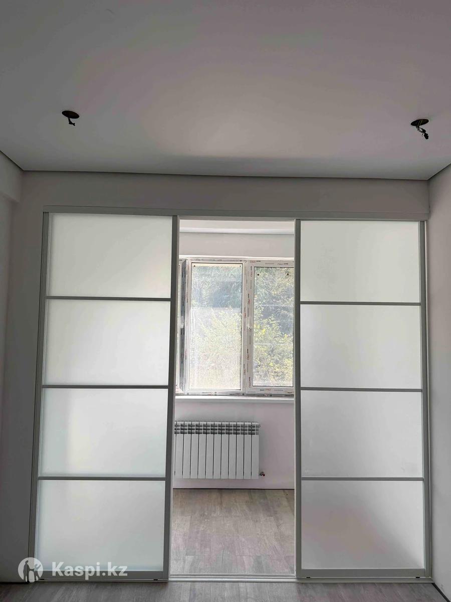 Раздвижная межкомнатная перегородка из матового стекла на алюминиевом профиле. Удобна для зонирования помещений, хорошо изолирует пространство и сохраняет естественное освещение