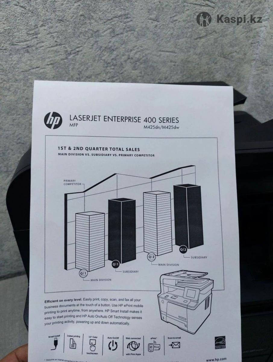 МФУ HP Pro М425dw принтер, сканер, копир Есть wi-fi Скоростной МФУ имеет двустороннюю автоматическую печать (дуплекс) Автоподатчик с автоматическим сканированием и копированием документы с двух сторон. Можно печатать через USB или локальную сеть Аппарат скоростной и надежный, в отличном состоянии, после полной профилактики, Печатает так же отлично. В комплекте заправленный картридж, USB кабель и шнур питание. Характеристики: Тип печати: лазерный Цветность печати: черно-белая Кол-во стр. в месяц - 50000 стр Скорость печати: 33 стр/мин Тип картриджа: CF280A, CF280X (Без чипа) Ресурс картриджа: 2700 страниц При заправке картриджа в замене чипа не нуждается Режим работы: 10:00 - 22:00 Без выходных Есть Каспи Ред и Каспи кредит На месте можно проверить на работу способность... Так же смотрите мои другие объявления....