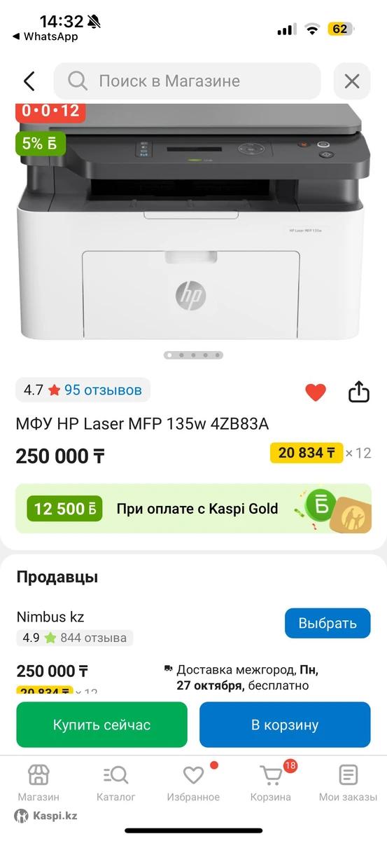 HP Laser MFP 135w (4ZB83A) Многофункциональное устройство 3-в-1: принтер, сканер, ксерокс. Поддержка беспроводной печати через Wi-Fi. Идеально подойдет для дома и офиса. В наличии 5 штук. Состояние: новые в упаковке. На Каспи стоит от 250 000 тенге‼️‼️‼️‼️‼️ Цена за штуку: 200 000 Самовывоз / доставка по договоренности.