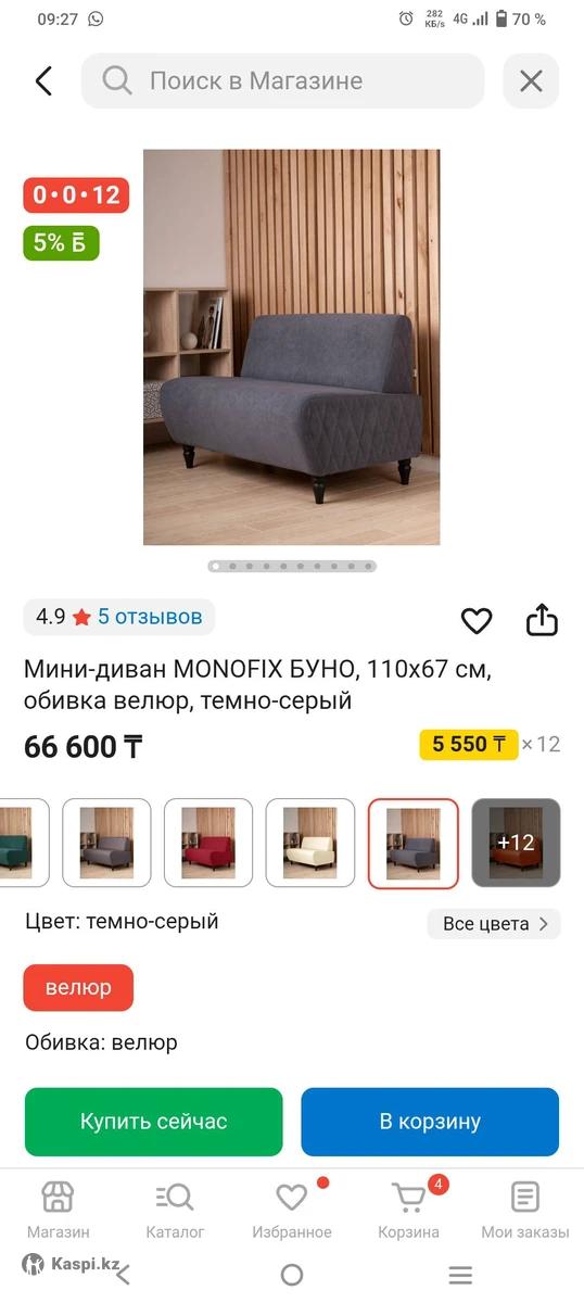Мини-диван MONOFIX БУНО, 110х67 см, обивка велюр, темно-серый