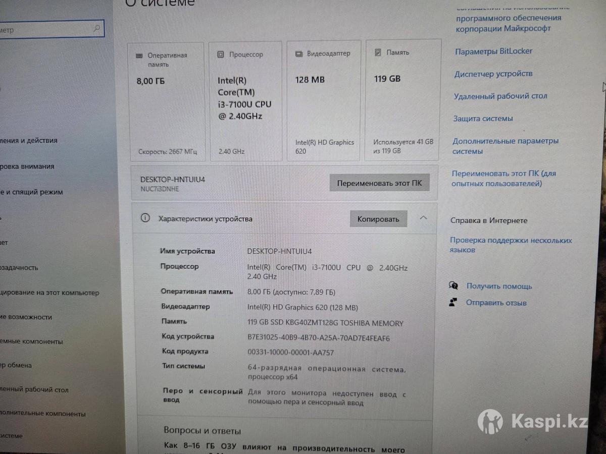 Мини ПК В наличии 2шт. Core i3-7100 2,4GHz Оперативная память 8Gb ddr4 ssd 128gb M.2 NVME Полностью рабочий Гарантия 2 дня на проверку Установлены все программы Windows, Office, архиватор, кодеки. Возможна доставка и установка за отдельную плату Возможна отправка почтой или курьерской службой по Казахстану. А также есть мониторы к ним от 7000тг
