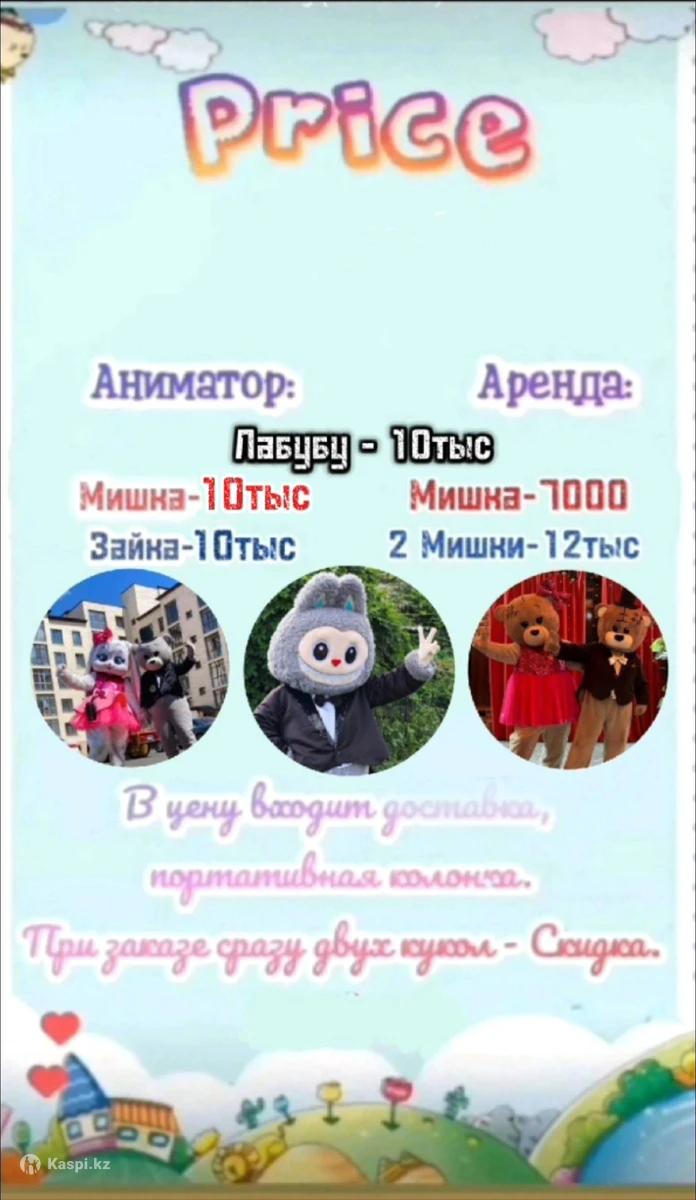 Хотите чтобы ваш праздник стал незабываемым ?:) • Наша зайка и мишка вручит под вашу любимую музыку подарок (это могут быть цветы, шарики и т.д) • Потанцует,обнимет, подарит улыбки на лицах. • Ну и конечно же сфотографируется и снимется в видео для ваших социальных сетей. • Встреча гостей из аэропорта • Поздравления с днем рождения в 00:00 и многое другое;) Выезжаем 24/7 по Караганде и городам спутникам. °°°°°°°°°°°°°°°°° Прайс: °°°°°°°°°°°°°°°°°° Поздравление : 15-20 (мин) Мишка - 10000 (мальчик/девочка) Зайка - 10000 (девочка) При заказе сразу двух ,скидка. - цена : 15 000тг Аренда без аниматора : 30-60 (мин) Мишка - 7000 (мальчик/девочка) В цену входит : - Доставка (привозим,забираем) - Портативная колонка.