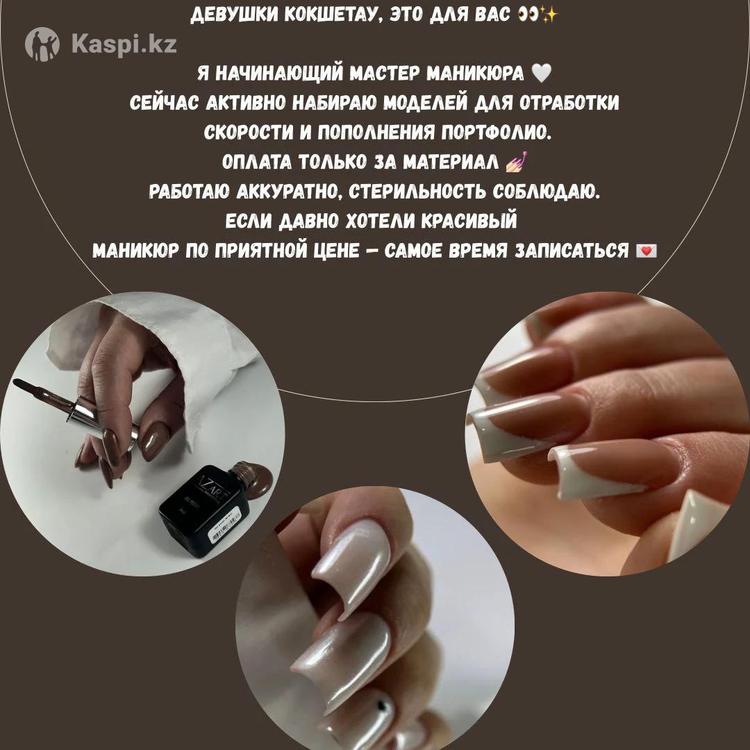 ✨ ИЩУ МОДЕЛЕЙ НА МАНИКЮР ✨📍 г. Кокшетау Я начинающий мастер маникюра и приглашаю моделей для отработки скорости и пополнения портфолио 🤍 Что вас ждёт:💅 Чистый аккуратный маникюр🎨 Покрытие гель-лаком📸 Красивые фото работ 💸 Оплата только за материалы:• 1500 тг — только чистка (маникюр без покрытия)• 3000 тг — покрытие гель-лаком• 4000 тг — наращивание ⏰ Время работы: 2–3 часа Буду очень рада каждой девушке, которая поддержит начинающего мастера 🫶Если давно хотела красивые и ухоженные ноготки по приятной цене — это твой шанс ✨
