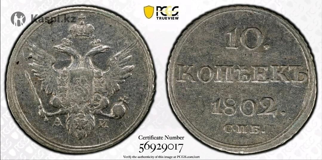 10 копеек 1802 года — Александр I Российская Империя, Санкт-Петербургский монетный двор PCGS сертификация: №56929017 Серебряная монета эпохи правления императора Александра I, выпущенная в начале XIX века. Аверс: герб Российской империи — двуглавый орел с императорскими регалиями (держава, скипетр, меч), на груди щит с изображением Георгия Победоносца. Под орлом инициалы минцмейстера — А.И. Реверс: номинал "10 КОПѢЕКЪ", год выпуска 1802, ниже обозначение монетного двора — С.П.Б. - Номинал: 10 копеек - Год: 1802 - Материал: серебро - Вес: 2,07 г - Диаметр: 20 мм - Гурт: рубчатый - Монетный двор: Санкт-Петербургский - Грейд и подлинность подтверждены PCGS (сертификат №56929017) Отличное состояние для своего возраста, высоко ценится коллекционерами монет царской