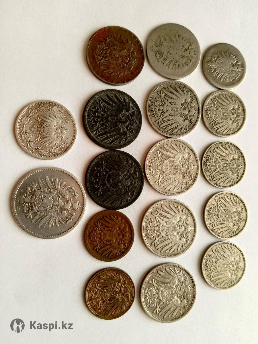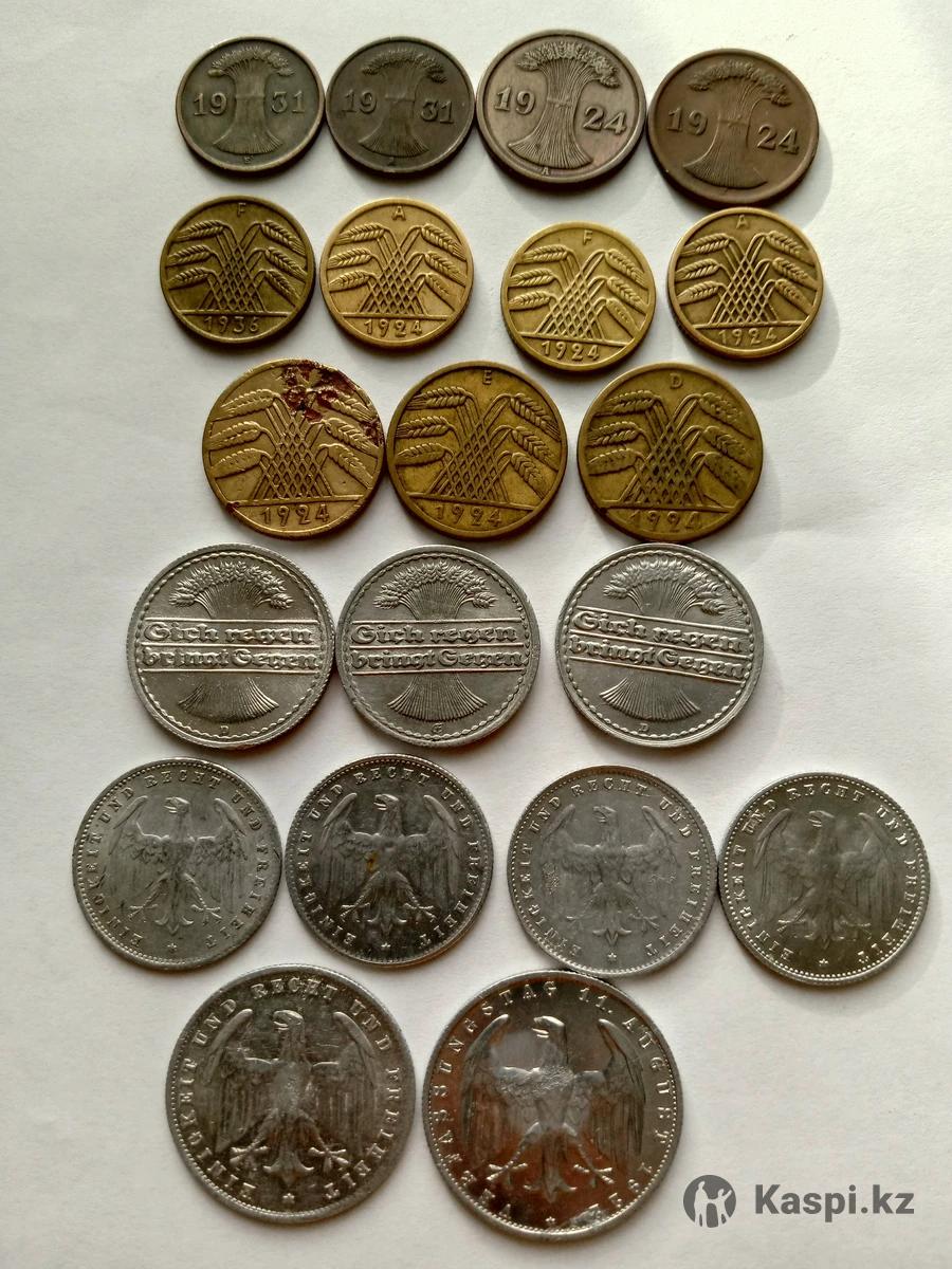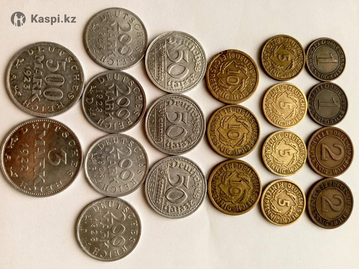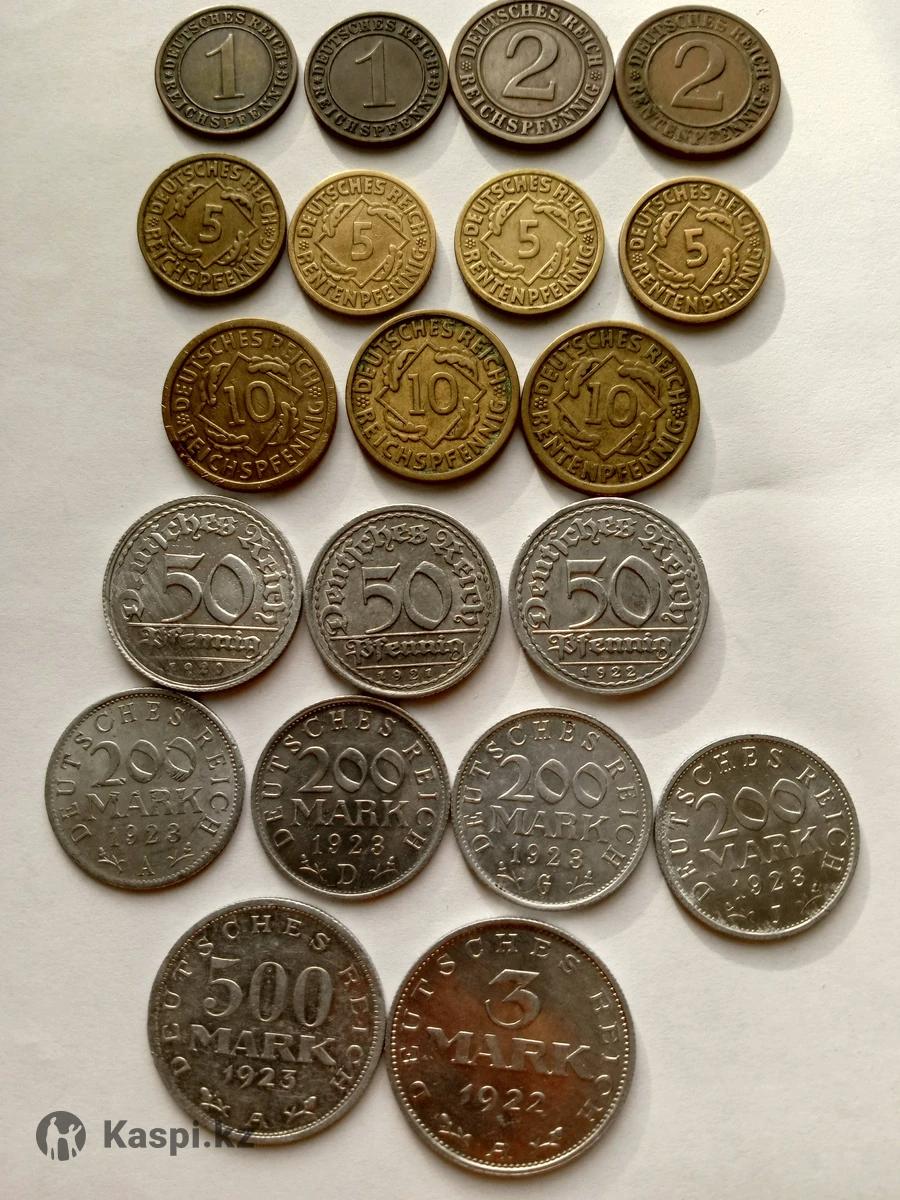 Веймарская республика: 1 рейхспфенниг 1931 (Е) - 700 тг. 1 рейхспфенниг 1931 (А) - 700 тг. 2 рейхспфеннига 1924 (А) - 1000 тг 2 рентенпфеннига 1924 (J) - 1000 тг 5 рейхспфеннигов 1936(F) - 650 тг 5 рентенпфеннигов 1294 (А) - 700 тг. 5 рентенпфеннигов 1294 (F) - 700 тг. 5 рентенпфеннигов 1294 (А) - 700 тг. 10 рейхспфеннигов 1924 (А) - 500 тг 10 рейхспфеннигов 1924 (Е) - 800 тг 10 рентенпфеннигов 1924 (D) -1000 тг 50 пфеннигов 1920 - 1100 тг 50 пфеннигов 1921 - 1100 тг 50 пфеннигов 1922 - 1100 тг 200 марок 1923 (А) - 1200 тг 200 марок 1923 (D) - 1200 тг 200 марок 1923 (G) - 1200 тг 200 марок 1923 (J) - 1200 тг 500 марок 1923 (А) - 1500 тг 3 Марки 1922 (А) - 1800 тг. Германская империя: 5 пфеннигов 1876 - 550 тг 5 пфеннигов 1906 - 700 тг 5 пфеннигов 1911 - 700 тг 5 пфеннигов 1913 - 700 тг 5 пфеннигов 1914 - 700 тг 10 пфеннигов 1874 - 900 тг 10 пфеннигов 1899 - 1000 тг 10 пфеннигов 1911 - 1000 тг 10 пфеннигов 1912 - 1000 тг 10 пфеннигов 1913 - 1000 тг 10 пфеннигов 1916 - 1500 тг.(Цинк) 10 пфеннигов 1917 - 1300 тг.(Железо) 10 пфеннигов 1922 - 1300 тг(Железо) 1 пфенниг 1906 - 600 тг 1 пфенниг 1912 - 600 тг 1/2 марки 1905 - 4500 тг (Серебро) 1 Марка 1879 - 7000 тг (Серебро)