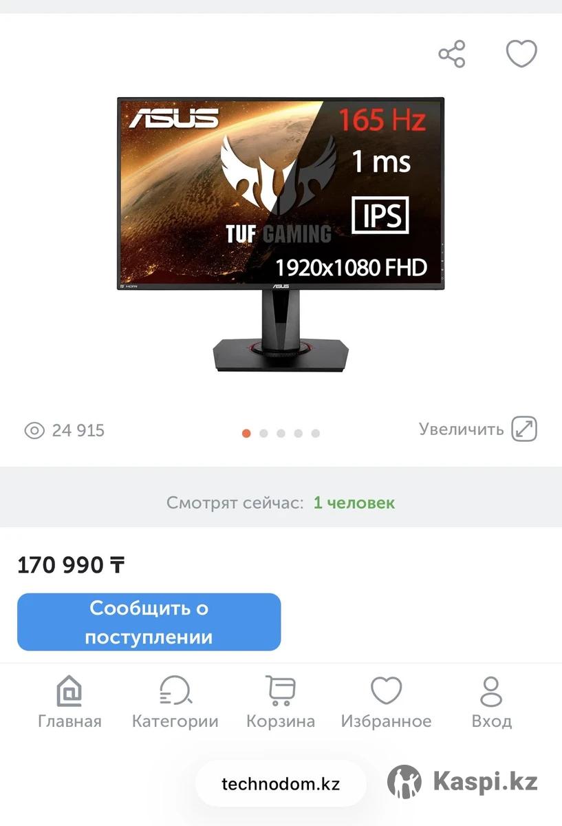 Продаю игровой монитор Asus TUF 165 герц. Монитор находится в идеальном состоянии. Характеристики монитора: Asus TUF VG279QR Частота обновления кадров:165 Гц Диагональ: 27 дюйм Разрешение: 1920×1080 Тип матрицы: IPS Монитор без битых пикселей, имеет ряд функций, можно менять насыщенность, резкость, яркость картинки, режимы. Отдаю вместе с DisplayPort,так же те кто хочет приобрести монитор к ноутбуку есть провод тайпси дисплей порт. Активно пользовался монитором месяца два,в основном просто стоял