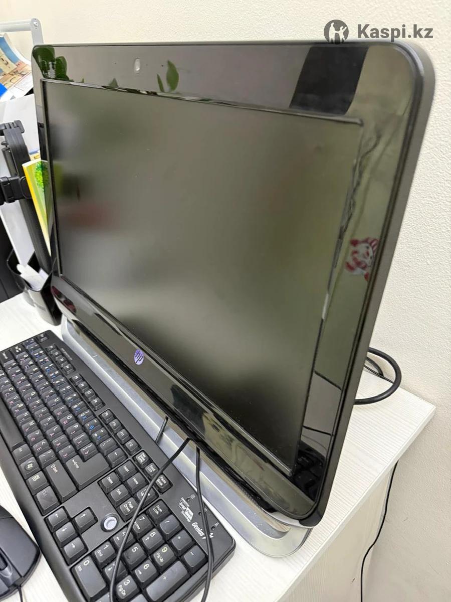 На фотографиях представлен не просто монитор, а моноблок (All-in-One PC) марки HP. Это полноценный компьютер, где системный блок встроен в корпус экрана. Вот подробное описание устройства: Внешний вид и конструкция • Бренд: HP (Hewlett-Packard), о чем свидетельствует фирменный логотип в центре под экраном. • Тип корпуса: Моноблок в глянцевом черном пластиковом корпусе. Дизайн характерен для линеек HP Omni или HP Pavilion начала-середины 2010-х годов. • Экран: Дисплей имеет достаточно широкие рамки. Поверхность экрана кажется матовой или полуматовой, что удобно для работы при ярком освещении (меньше бликов). • Подставка: Устройство опирается на изящную серебристую (металлик) дугообразную подставку, которая придает конструкции визуальную легкость. Функциональные элементы • Веб-камера: В верхней части над экраном расположена встроенная камера и микрофон для видеосвязи. • Аудио: Под экраном находится перфорированная решетка, за которой скрываются встроенные динамики. • Периферия: В комплекте идет проводная полноразмерная клавиатура Genius с русской и английской раскладкой. • Проводная оптическая мышь Genius. • Видны кабели питания и подключения периферии, уходящие за заднюю панель. Общее впечатление Это рабочая лошадка для офисных задач, учебы или домашнего использования. Благодаря формату «моноблок» он занимает минимум места на столе, так как нет необходимости в отдельном громоздком системном блоке.