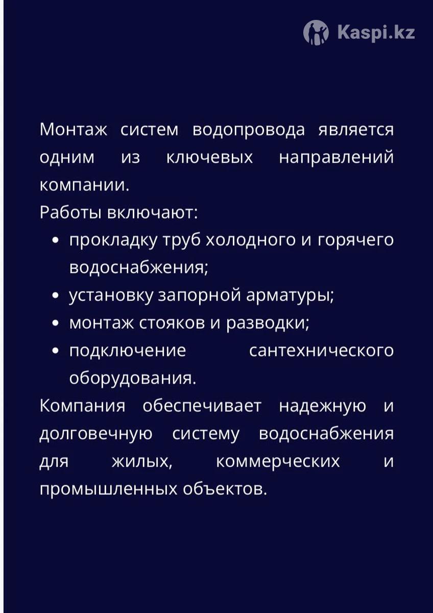 Профессиональный монтаж отопления, водоснабжения, теплотрасс и пожаротушения. ТОО «СтройТеплоСервис KZ» (БИН 210740002014) уже несколько лет успешно выполняет полный спектр монтажных работ по инженерным системам в Костанае и по всему Казахстану. Мы беремся за объекты любой сложности: • частные дома, коттеджи, дачи • многоквартирные дома и ТСЖ • коммерческие помещения (магазины, офисы, кафе) • социальные объекты (школы, детские сады, медучреждения) • промышленные и складские здания Основные услуги: • Монтаж систем отопления (радиаторное, водяное, воздушное, теплые полы, бойлеры, котлы) • Установка и разводка систем водоснабжения и канализации (ХВС, ГВС, ПВХ, полипропилен, металлопластик) • Прокладка теплотрасс (в каналах, бесканально, в ППУ-изоляции) • Монтаж автоматических систем пожаротушения и противопожарного водопровода • Сборка, монтаж и пусконаладка элеваторных узлов, тепловых пунктов, ИТП Поченьу выбирают нас? • Работаем строго по договору • Соблюдаем все сроки (даже в сезон!) • Даем официальную гарантию от 12 до 60 месяцев • Используем проверенные материалы и оборудование • Бесплатный выезд специалиста + смета • Опытные сертифицированные монтажники • Честные цены без скрытых доплат Готовы к срочным заявкам! Уже сегодня можем приехать на объект.