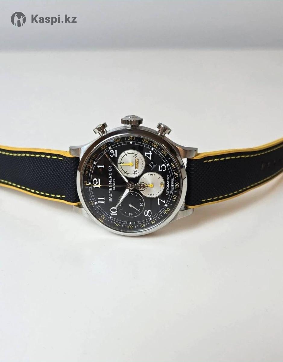 Baume Mercier Capeland Shelby Cobra 44 мм Limited Steel Mens Watch 65798. Автоматический механизм хронографа с автоподзаводом. Корпус из нержавеющей стали диаметром 44,0 мм. Задняя крышка из сапфирового стекла. Кнопки хронографа. Секундная стрелка хронографа имеет логотип Cobra. . Сапфировое стекло, устойчивое к царапинам. Черный циферблат с напечатанными арабскими цифрами часовых меток. Отображение даты между 4 и 5 часами. Три дополнительных циферблата хронографа — 60 секунд, 30 минут и 12 часов. Черно-желтый каучуковый ремешок. В идеальном состоянии, как новые.