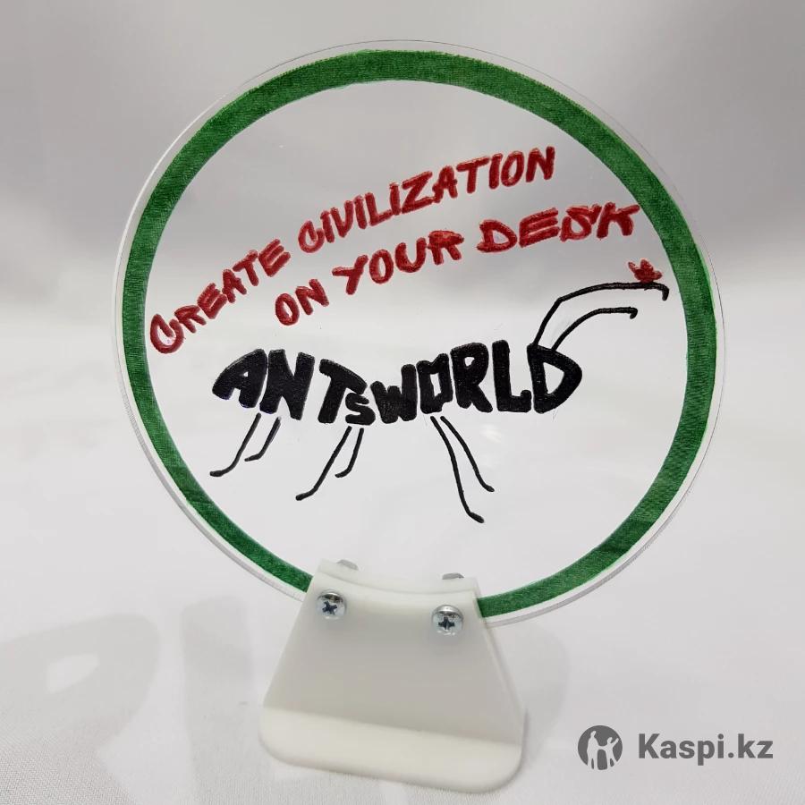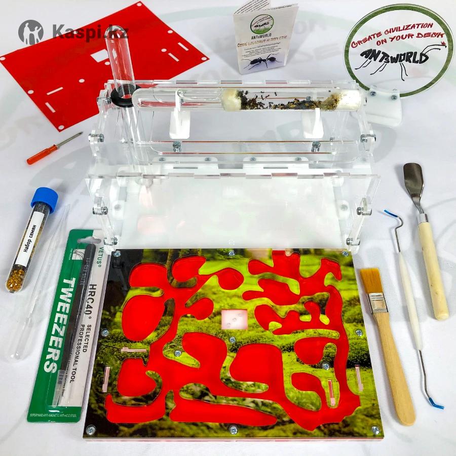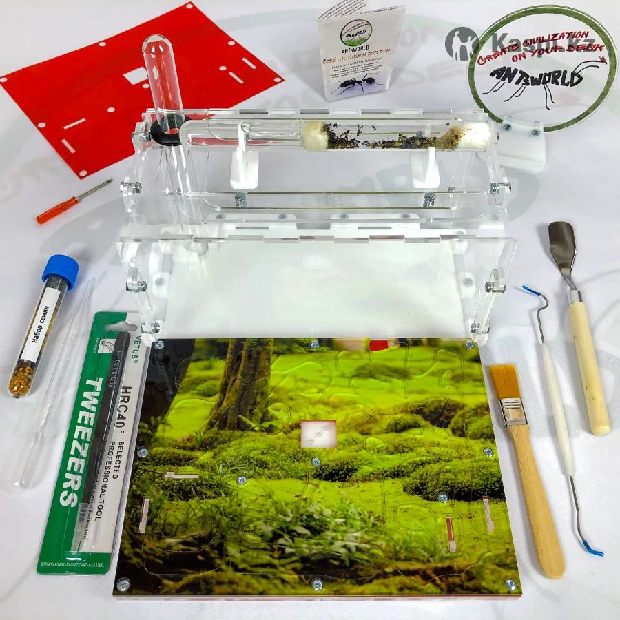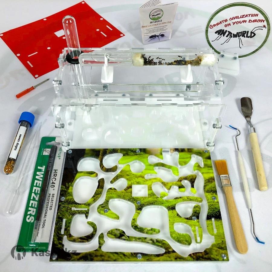 Муравьи и Муравьиные фермы от интернет-магазина ANTsWORLD Стартовый комплект с формикарием МИНИ — 25000. Расцветка — Лесная поляна. Возможна рассрочка Kaspi RED! В КОМПЛЕКТ ВХОДИТ: — акриловый формикарий, размер 250х200х100мм; — сборочные и запасные детали, винты и гайки; — уплотнительный сальник для подключения пробирки; — сменная цветная накладка Лес; — 3D затемнители ходов с установкой в пазы; — красная пленка от УФ излучения; — муравьи Messor Structor — Муравей Жнец (1 матка +50 рабочих); — корм на 1 год (8 видов зерен); — корм белковый; — магнитная отвертка для удобства сборки; — пипетка для увлажнения с мерными делениями; — специальный пинцет 14см; — кисть для уборки (широкая); — двойной крючок для пробирки инкубатора; — лопатка мини; — поилка-увлажнитель арены; — авто-увлажнение жилых ходов! НОВИНКА! — дополнительная пробирка; — инструкция по уходу за муравьями; — песочек; — кормушка; — надежная упаковка; — инструкция по сборке арены; — видео-инструкция по сборке и декорированию арены, и заселению муравьев; — информационное сопровождение и консультации от самых опытных мирмикиперов. ДОПОЛНИТЕЛЬНЫЕ ОПЦИИ: — огромный выбор декораций для арены (сказочные домики, замки, пирамиды, деревья, заборчики, газончики, мох, песочек, камушки цветные и др.); — аксессуары (поилка, кормушка, подставка, мини-пылесос, термоковрик, микроскоп, термометр, гигрометр и многое др.); — индивидуальных сменных цветных накладок; — гравировка любых надписей и логотипов на стенках формикария; — формикария по Вашему проекту; — подарочная упаковка, с оригинальной печатью воском. Доставка в самые кратчайшие сроки по Казахстану и странам СНГ. Доставка по Нур-Султану и Караганде в течении дня. Позвоните или напишите нам. Добро пожаловать!