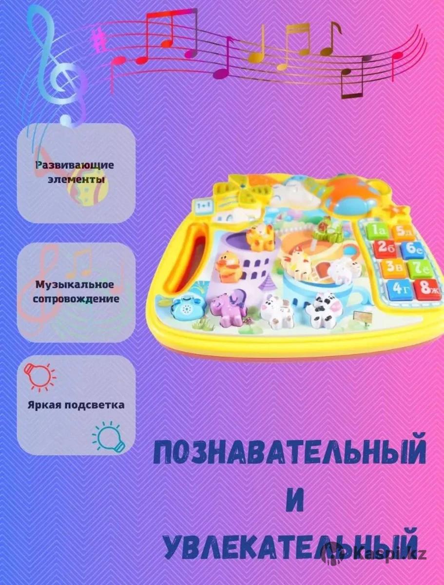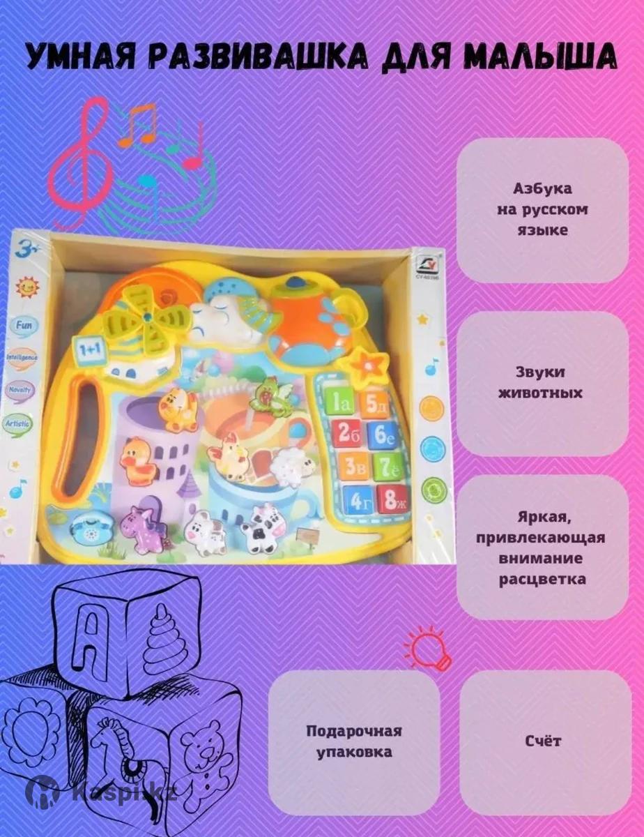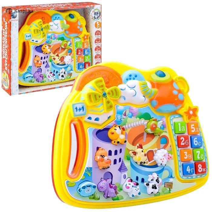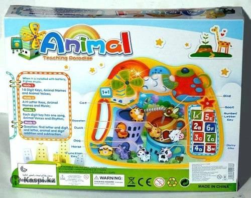 Музыкальный игровой центр, 6039B Цена 3000 insta - Игрушка предназначена для изучения цифр от 1 до 8, букв от А до Ж, решения простых арифметических примеров, изучения животных и птиц. Фигурки животных служат кнопками, при нажатии они издают соответствующие звуки. Включается игрушка нажатием на телефончик в левом нижнем углу, после этого звучит звуковой сигнал. Эта же кнопка служит для переключения режимов. 1 режим: при нажатии на кнопку игрушка произносит название животного и звук, который оно издает, а также название цифр. 2 режим: животное издает звук, но без названия, затем звучит мелодия. Вместо цифр произносятся буквы. 3 режим: все кнопки становятся музыкальными. 4 режим: игрушка просит ребенка найти определенную букву. 5 режим: игрушка просит решить пример с цифрами.