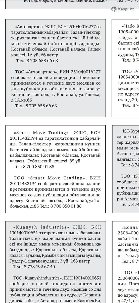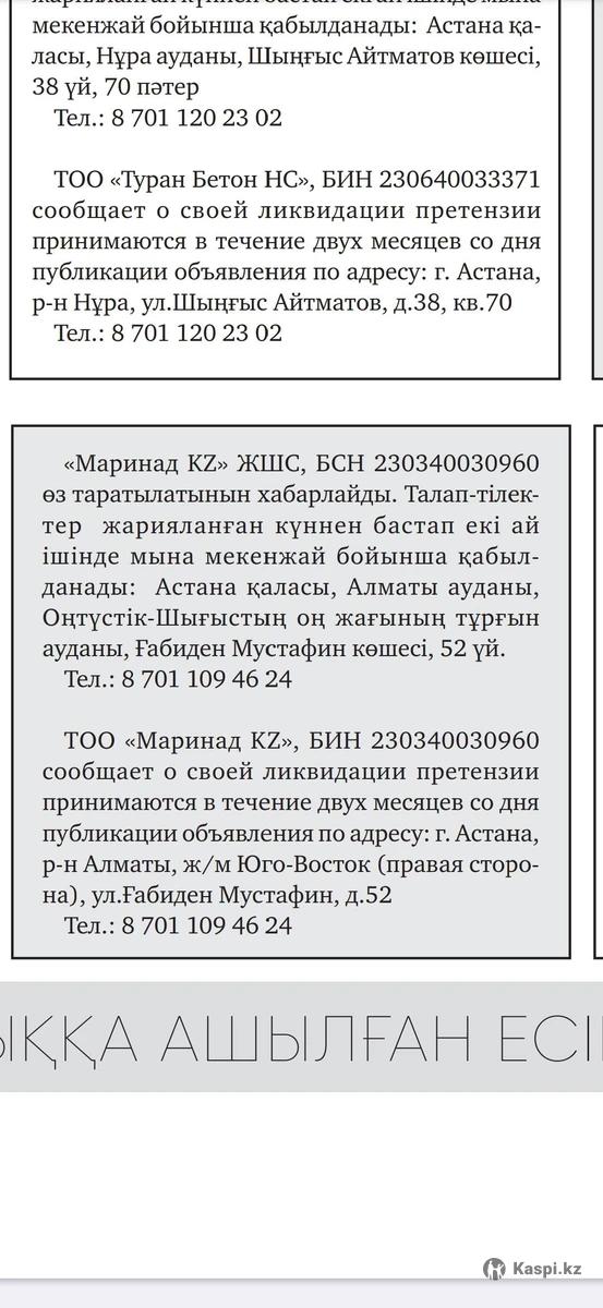 Ликвидация ТОО в газету Стоимость объявления 10 000 тг Рус/каз Публикация каждую субботу Выдаем ЭСФ, АВР Типография в Астане Газета Республиканского значения