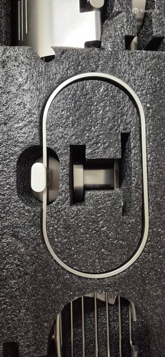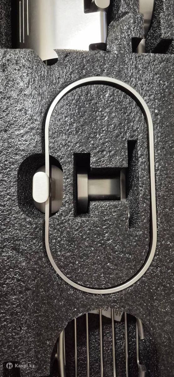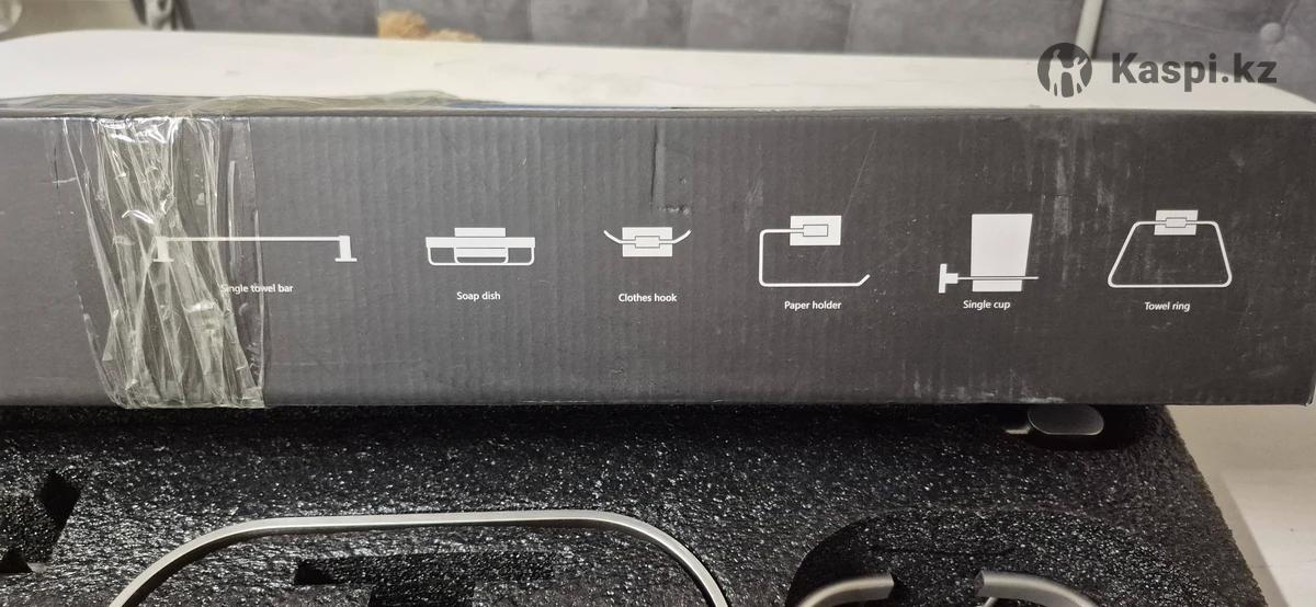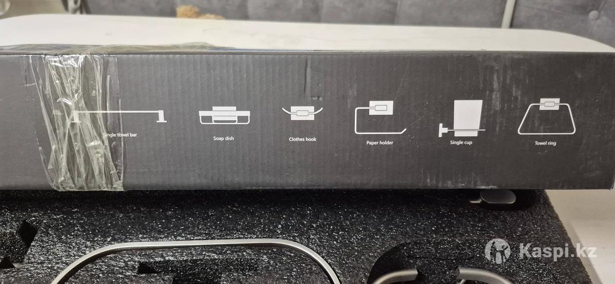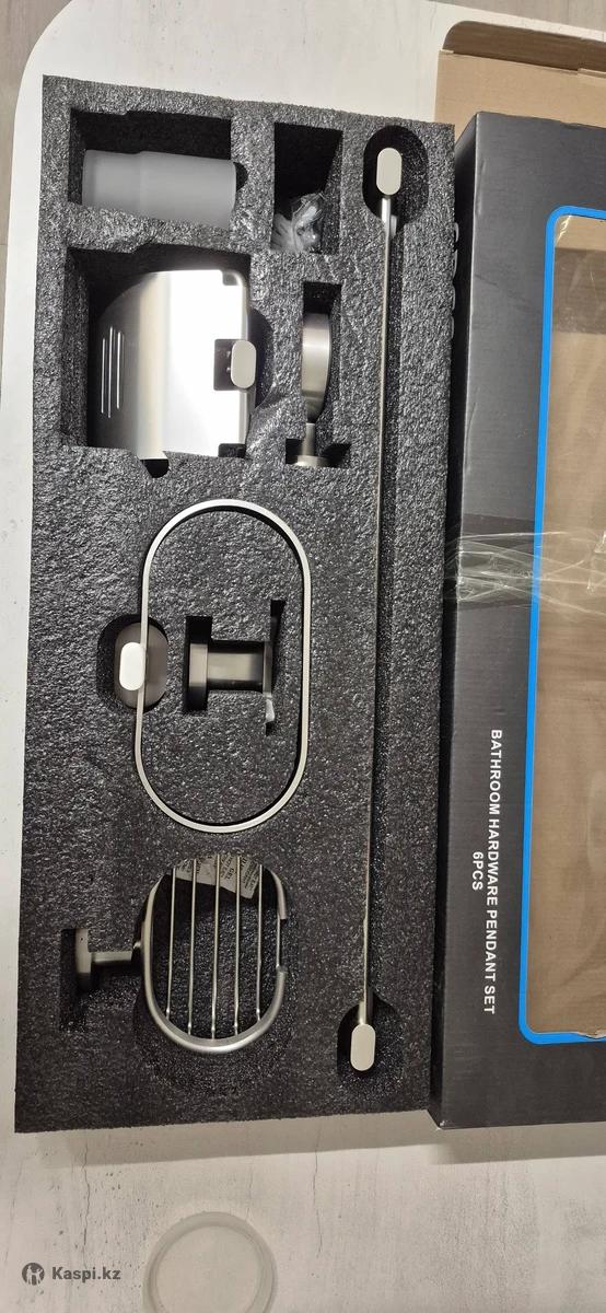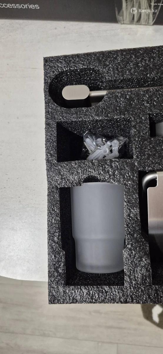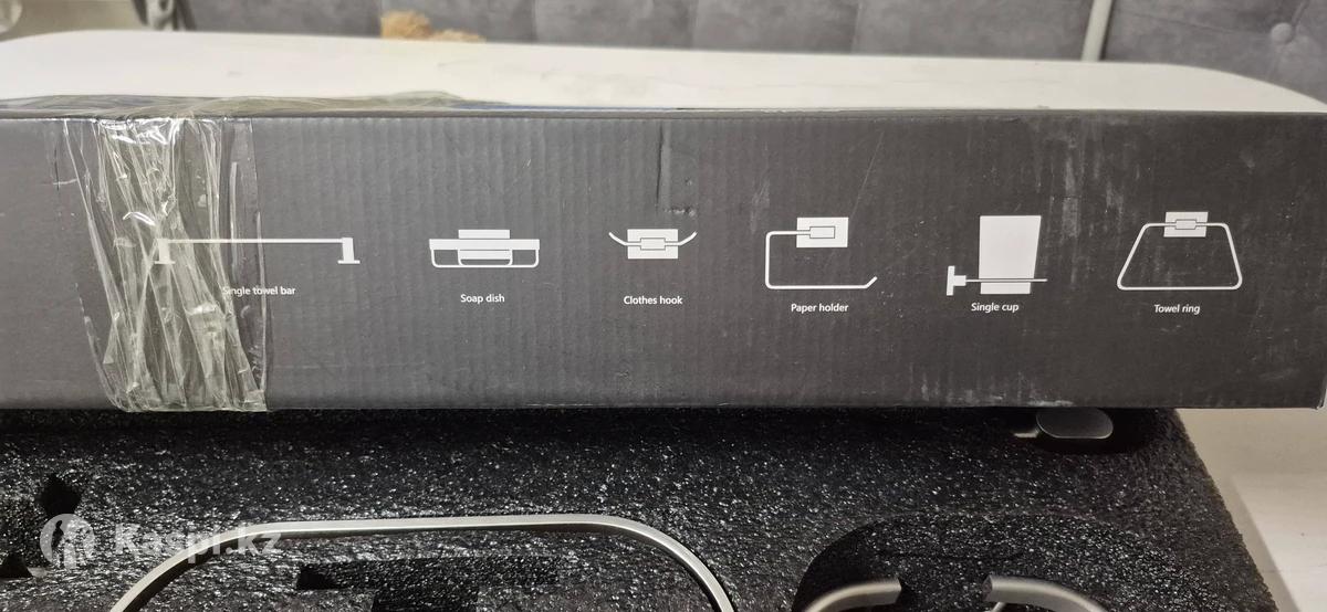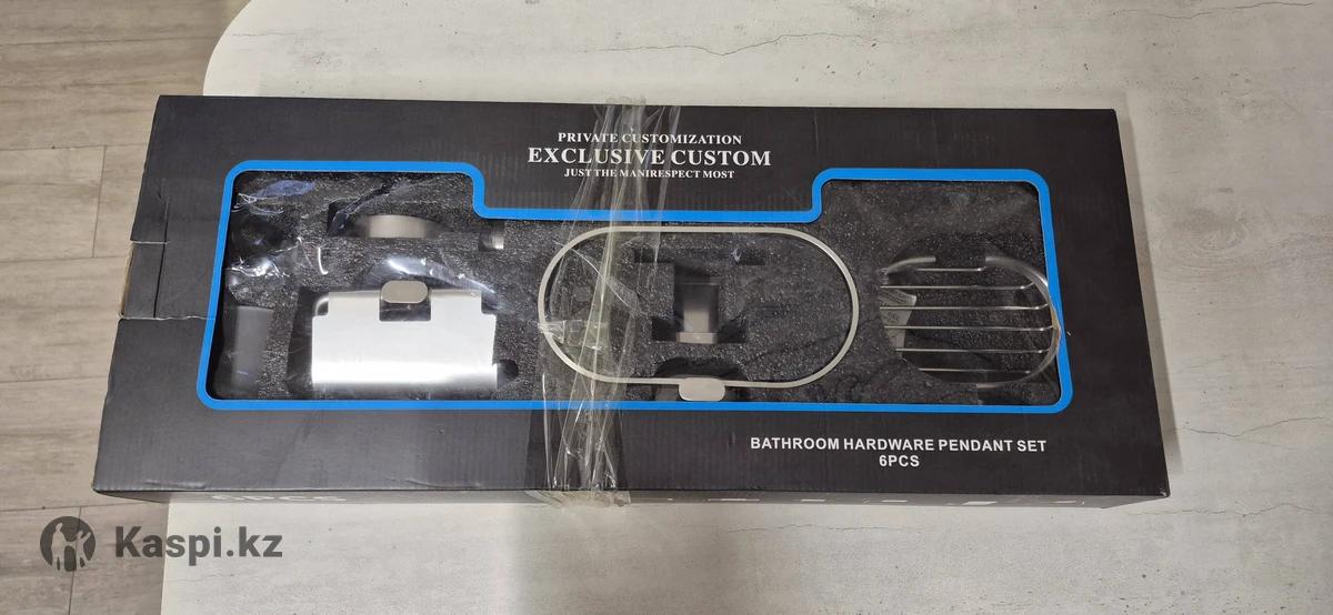 Набор аксессуаров для ванной комнаты и туалета (6 предметов): держатель для полотенца, кольцо для полотенца, мыльница, крючок для халатов, держатель для туалетной бумаги, стакан для зубных щеток. Выполнен из прочного металла, устойчив к влаге и коррозии. Цвет — сатин. Новый. Покупали 2 месяца назад за 20000 тг.