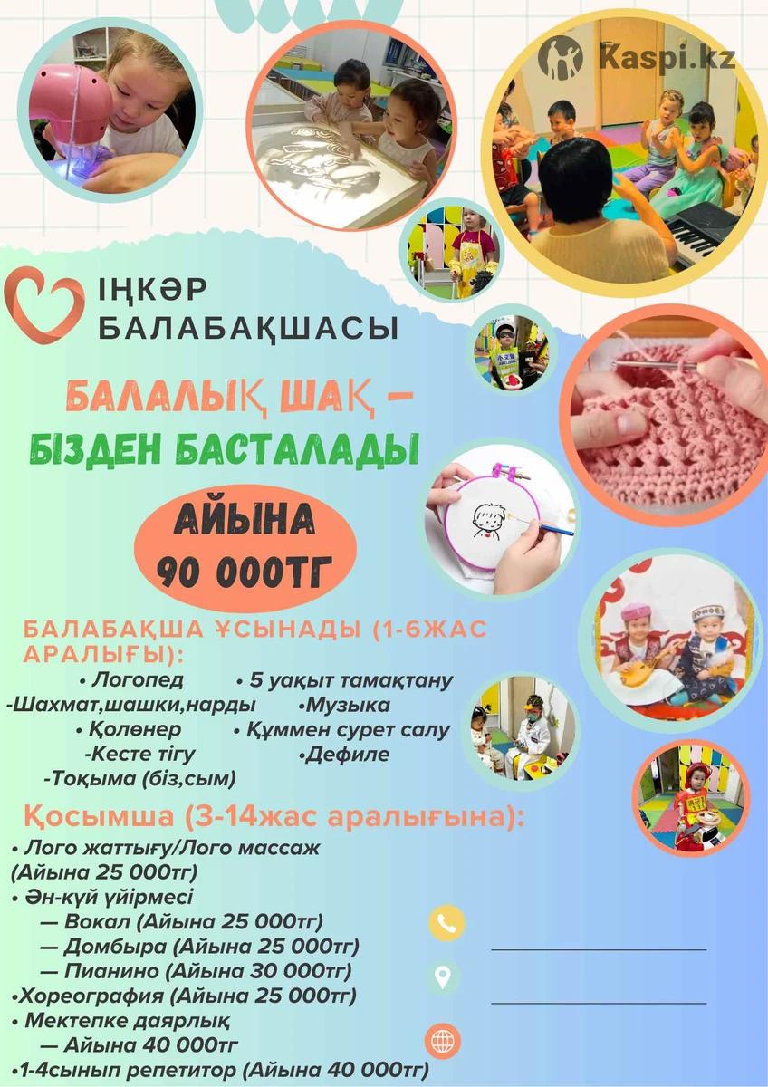 Детский сад «Іңкәр» приглашает малышей в теплую и уютную атмосферу, где заботятся о здоровье, развитии и комфорте каждого ребенка. В месяц 90 000тг. Мы предлагаем: •Пятиразовое сбалансированное питание •Музыкальные занятия и пение •Обучение вязанию и творческим навыкам •Развивающие занятия по программе •Индивидуальные уроки с логопедом •Ночная смена с 18:30 до 7:30 (1000 тг/час) •Круглосуточная работа 7 дней в неделю •Оплата в субботу и воскресенье — по договоренности 📍 Адрес: город Астана, Кабанбай батыра 40 📞 Телефон: