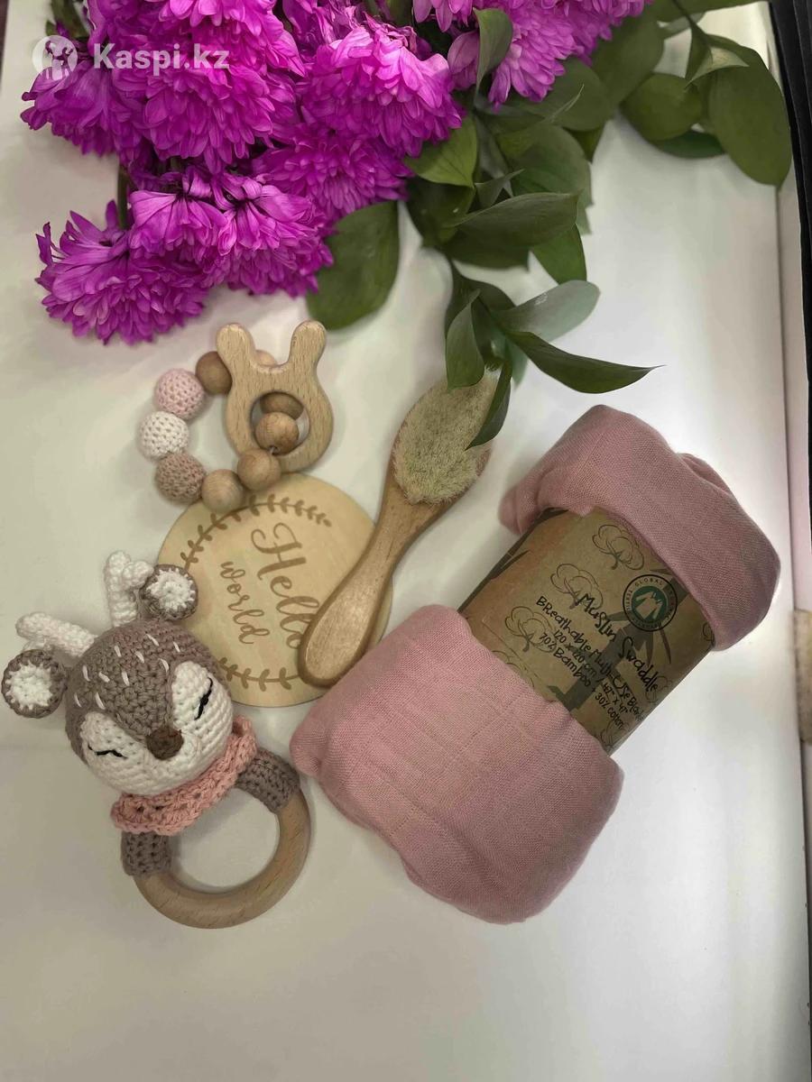 Подарочный набор для новорожденного . В комплекте : мягкая муслиновая пеленка, вязаная игрушка - погремушка из 100% хлопка , грызунок - прорезыватель для Зубов из пищевого селекона и бамбука , расческа из натуральной шерсти , деревянная табличка - привет мир . Набор в подарочной упаковке , завязан бантиком. Отлично подойдет на подарок !