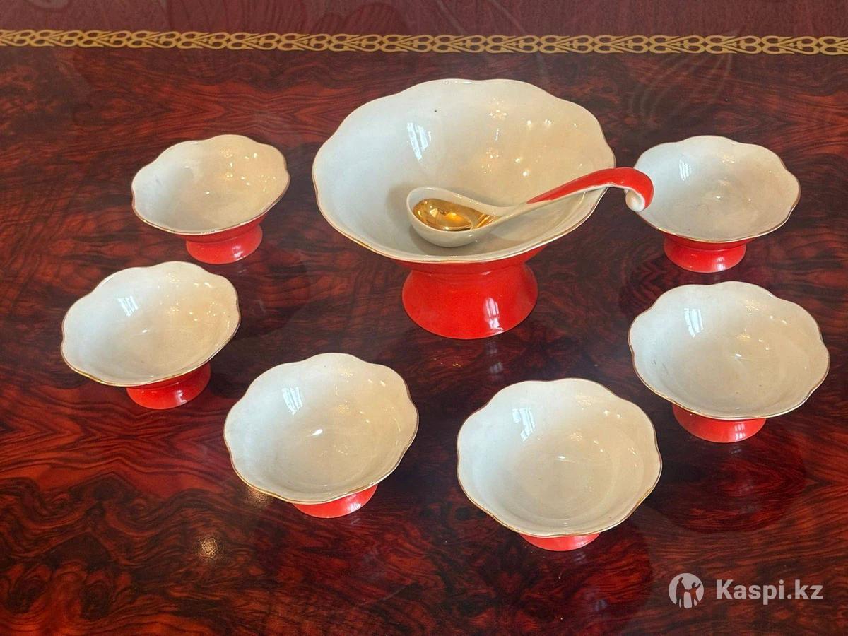 Сумской фарфоровый завод (СССР). Сервиз для подачи варенья, меда или других соусов, состоящий из большой супницы (или вазы) на ножке и шести небольших чаш (кесе). Посуда выполнена в белом цвете с красным основанием и золотистой отделкой по краю. Есть 2 комплекта данного набора