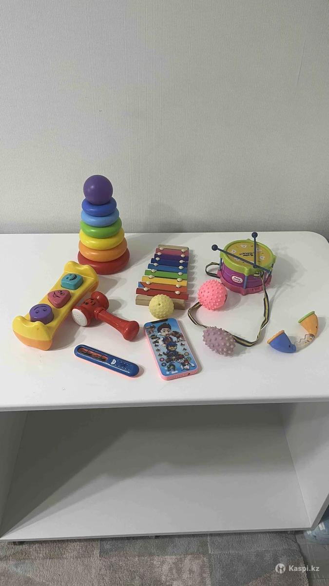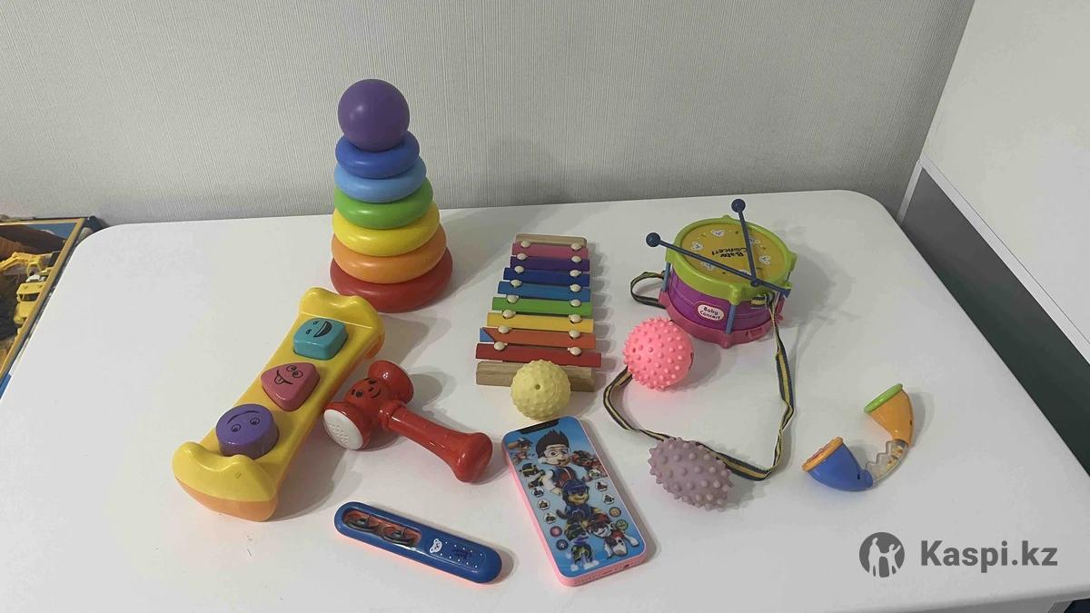 Набор игрушек для малыша: пирамидка, музыкальный барабан, ксилофон, стучалка с геометрическими фигурами и молотком, телефончик на батарейках для обучения английскому, прослушивания музыки, мячики для развития ручек и пальчиков, а также фигурки в песочницу.