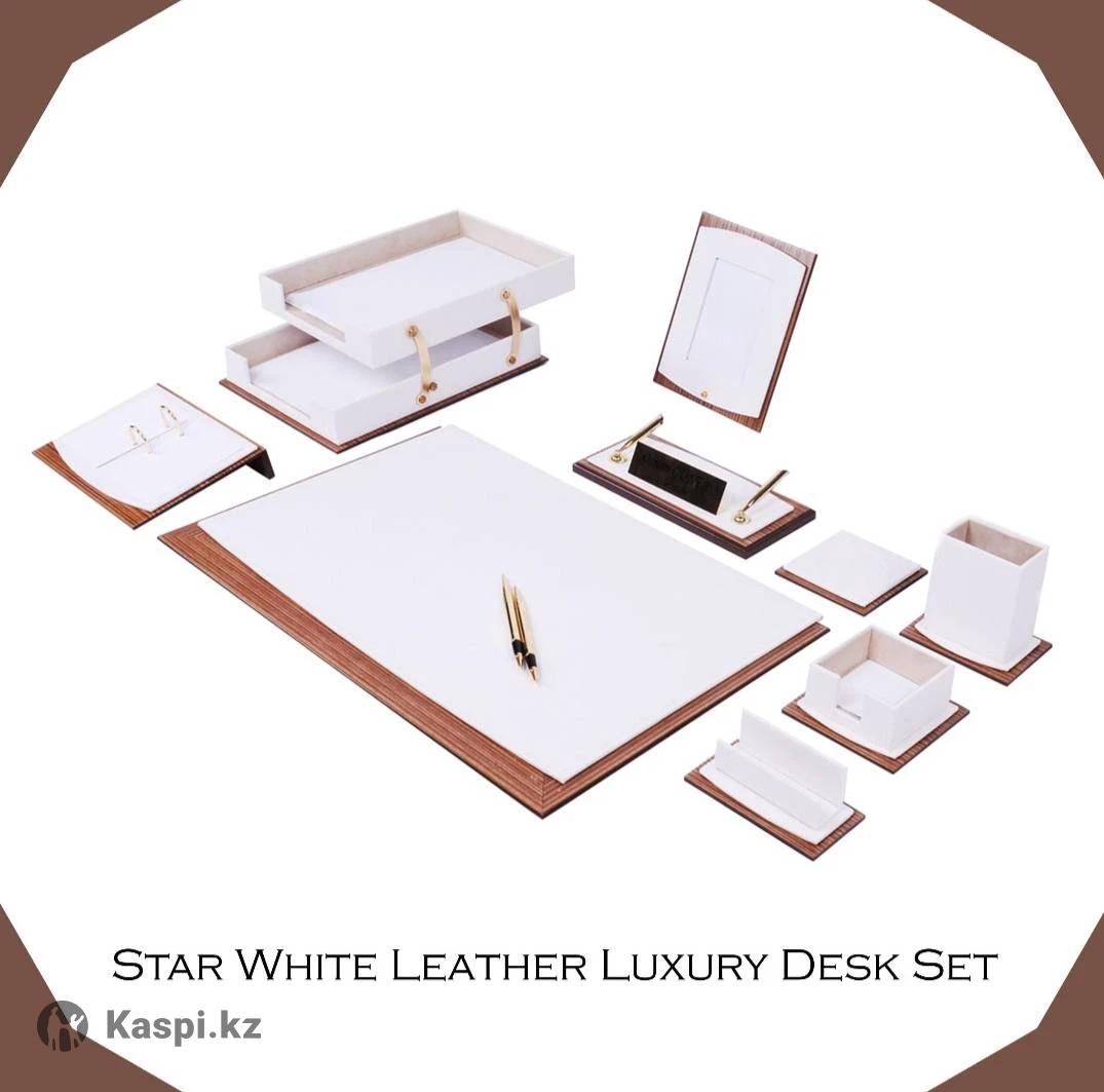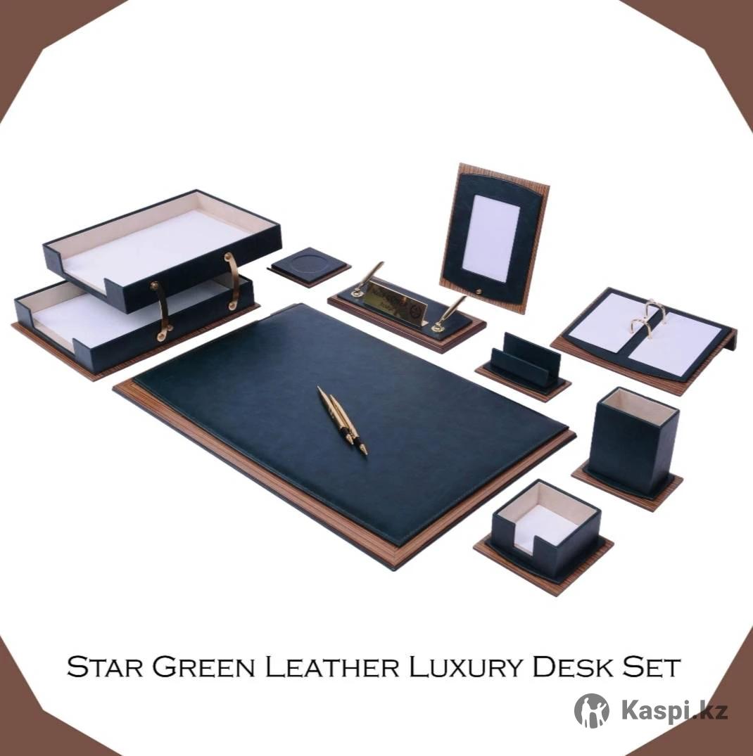 Элегантный настольный набор премиум-класса из дерева и кожи с высоким качеством изготовления. В комплекте 11 практичных аксессуаров для организации рабочего пространства. В комплекте: настольный коврик с крышкой (58×39 см), двойной лоток для бумаги, фоторамка, блокнот, держатель для ручек, подставка под стакан, держатель календаря, визитница с карманом для скрепок, набор из роллер-ручки и перьевой ручки, подставка для имени. ✔ 100% ручная работа ✔ Экологичные и нетоксичные материалы ✔ Срок службы до 10 лет ✔ Надежная индивидуальная упаковка