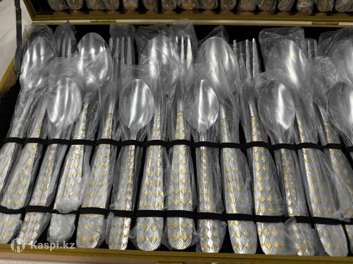 Новый набор, запечатанный с упаковкой. Набор столовых приборов на 12 персон: столовые ложки, вилки, чайные ложки, ножи. По 12 штук большие и маленькие ложки и вилки. Готовый чемодан. Можно на подарок , можно для себя приобрести.