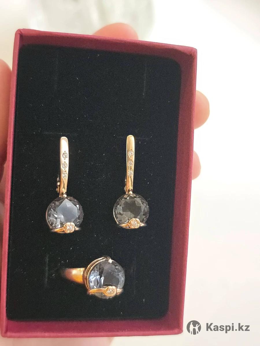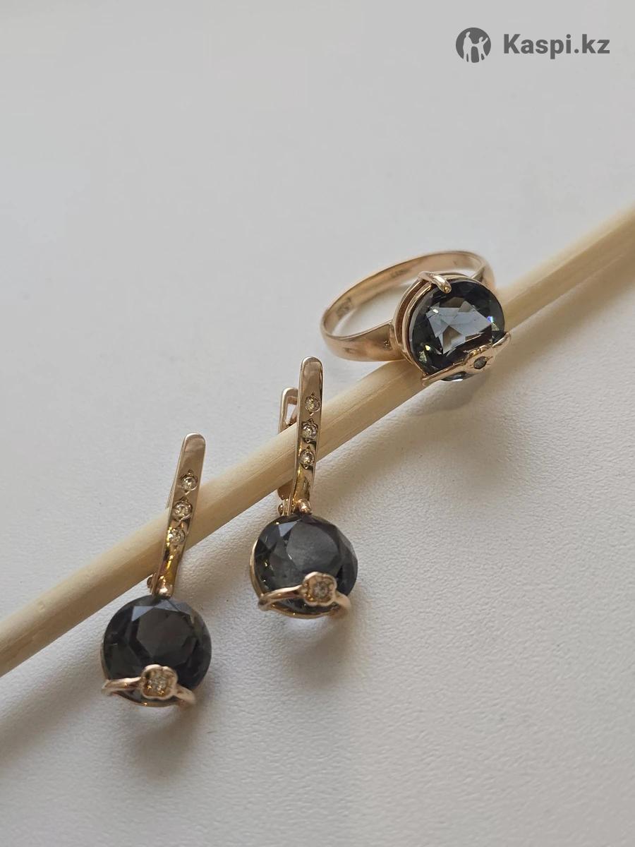 Набор комплект золотой серьги и кольцо. Проба 585. Самый тяжелый по весу из всей этой серии - общий вес 8.6 грамм. Обычно эти наборы от 4 до 8 граммов идут. Производство и печать на изделии России. Отличное качество, крепкое золото, надежные застежки на серьгах. Грани камней прекрасно ловят свет и переливаются. Название камня черный бриллиант.