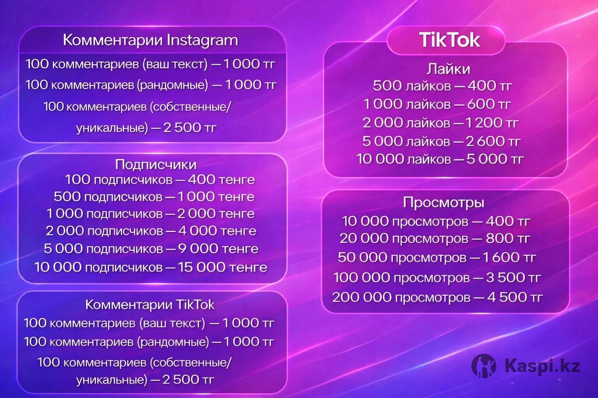 Накрутка в социальных сетях 👾 ✅ Надеждая Оплата ⚡️ Скорость поступления 📶 Качество накрутки 📷 INSTAGRAM — Подписчики 100 подписчиков — 350 тг 500 подписчиков — 1 000 тг 1 000 подписчиков — 2 000 тг 2 000 подписчиков — 4 000 тг 5 000 подписчиков — 9 000 тг 10 000 подписчиков — 15 000 тг --------------------------------- ❤️ INSTAGRAM — Лайки 500 лайков — 400 тг 1 000 лайков — 600 тг 2 000 лайков — 1 200 тг 5 000 лайков — 3 000 тг 10 000 лайков — 5 000 тг --------------------------------- 👁 INSTAGRAM — Просмотры 1 000 просмотров — 100 тг 5 000 просмотров — 500 тг 10 000 просмотров — 1 000 тг 20 000 просмотров — 2 000 тг 50 000 просмотров — 3 500 тг --------------------------------- 💬 INSTAGRAM — Комментарии 100 комментариев (ваш текст) — 1 000 тг 100 комментариев (рандомные) — 1 000 тг 100 комментариев (собственные/уникальные) — 2 500 тг --------------------------------- 🔁 INSTAGRAM — Репосты 100 репостов — 350 тг --------------------------------- 🎵 TIKTOK — Подписчики 100 подписчиков — 400 тг 500 подписчиков — 1 000 тг 1 000 подписчиков — 2 000 тг 2 000 подписчиков — 4 000 тг 5 000 подписчиков — 9 000 тг 10 000 подписчиков — 15 000 тг --------------------------------- ❤️ TIKTOK — Лайки 500 лайков — 400 тг 1 000 лайков — 600 тг 2 000 лайков — 1 200 тг 5 000 лайков — 2 600 тг 10 000 лайков — 5 000 тг --------------------------------- 👁 TIKTOK — Просмотры 10 000 просмотров — 400 тг 20 000 просмотров — 800 тг 50 000 просмотров — 1 600 тг 100 000 просмотров — 3 500 тг 200 000 просмотров — 4 500 тг --------------------------------- 👍 Лайки на комментарии (TikTok) 100 лайков — 500 тг 500 лайков — 2 000 тг 1 000 лайков — 4 500 тг --------------------------------- 💬 TikTok — Комментарии 100 комментариев (ваш текст) — 1 000 тг 100 комментариев (рандом) — 1 000 тг 100 комментариев (уникальные/собственные) — 2 500 тг --------------------------------- 🔁 TikTok — Репосты / Сохранения 100 репостов — 500 тг 100 сохранений — 600 тг --------------------------------- ✈️ TG — Подписчики 100 подписчиков — 500 тг 500 подписчиков — 1 700 тг 1 000 подписчиков — 3 300 тг 2 000 подписчиков — 6 500 тг 5 000 подписчиков — 12 000 тг