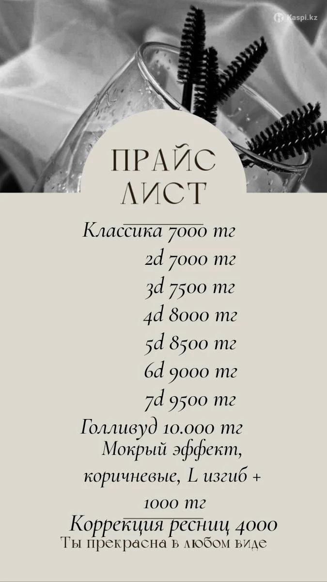 Запись по Предлагаю услугу наращивание ресниц: Классика - 7000 2д - 7000 3д - 7500 4д - 8000 5д - 8500 6д - 9000 Голливуд - 10 000 Мокрый эффект, коричневые, изгиб L + 1000 к прайсу Чужое снятие 1000 Стаж 10лет Принимаем по адресу Калихан Ыскак 15