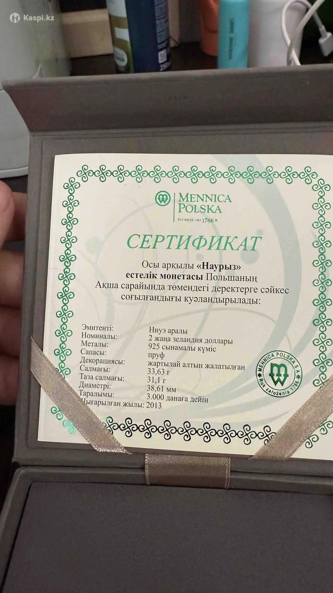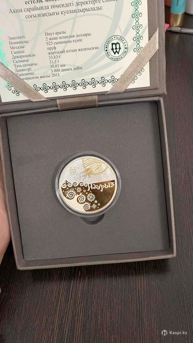 Салмағы 33,63 гр. Қорабы, сертификаты түгел. Жартылай алтын жалатылған.