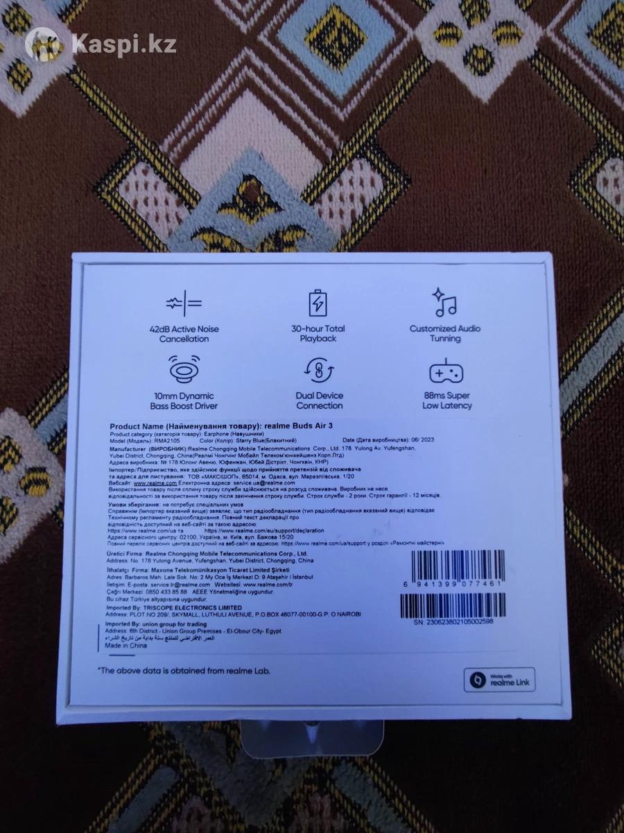 Продаю наушники Realme Buds Air 3. Состояние отличное,имеются пару царапин на корпусе,на работу не влияют и почти не заметные) Причина продажи: срочно нужны деньги по собственным обстоятельств) Имеется чек с гарантией в год Характеристики: · Активное шумоподавление (ANC) 42 дБ · Хороший бас (динамики 10 мм) · Влагозащита IPX5 (не боятся пота и дождя) · Автономность: до 30 часов с кейсом Комплектация: Полная коробка, наушники, кейс, зарядка USB-C, дополнительные амбушюры (все родное). Цена: 18000 ТГ (возможен небольшой торг упирается в срочность). Покупал в технодоме за 25000 тенге Показываю при встрече, проверяйте сколько угодно. Продаю срочно, поэтому цену сделал минимальной. Звоните или пишите в Номер: