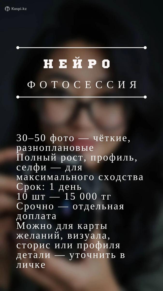 ✨ Нейрофотосессия 📸 30–50 фото — четкие, разноплановые 🧍♀️ Полный рост, профиль, селфи — для максимального сходства 📅 Срок: 1 день 💰 10 шт — 15 000 тг ⚡ Срочный заказ — отдельная доплата 🪄 Можно для карты желаний, визуала, сторис или профиля 💬 Все детали — личку