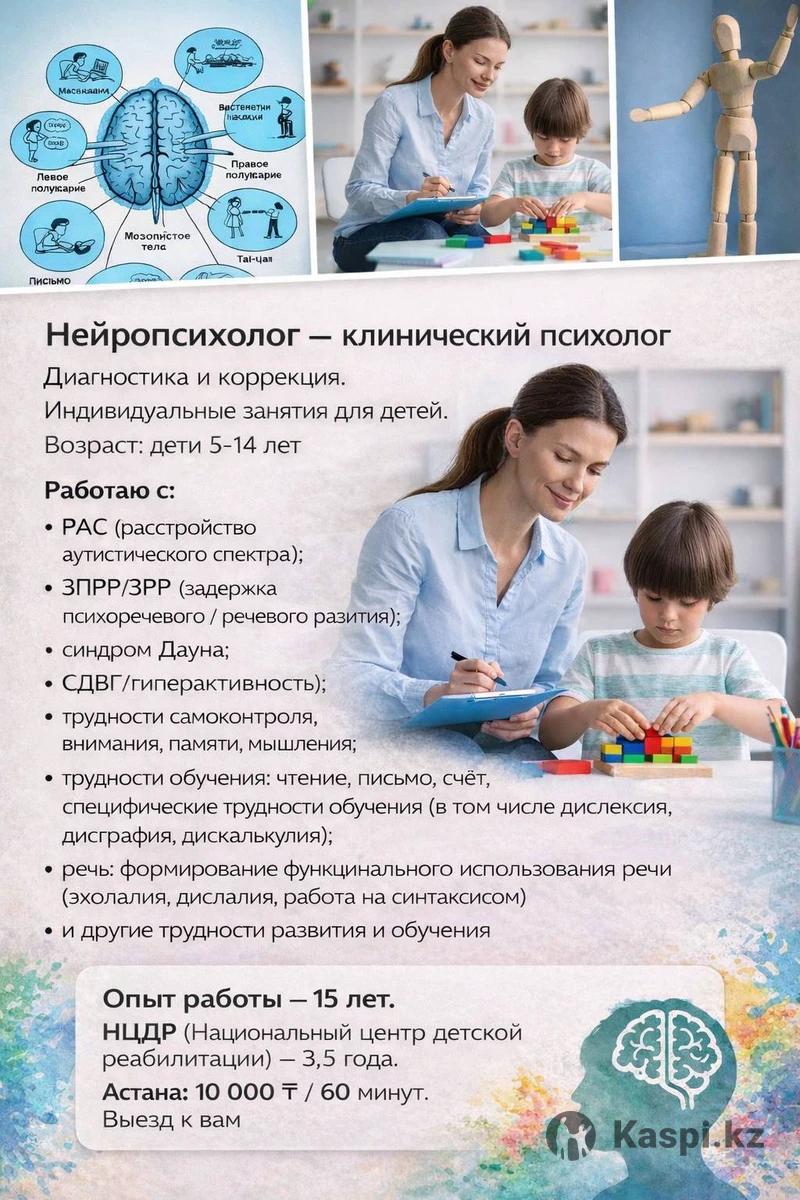 Диагностика и коррекция. Индивидуальные занятия для детей. Возраст: дети 5–14 лет. Работаю с: • РАС (расстройство аутистического спектра) • ЗПРР / ЗРР (задержка психоречевого / речевого развития) • синдром • СДВГ, гиперактивность • трудности самоконтроля, внимания, памяти, мышления • трудности обучения: чтение, письмо, счёт; специфические трудности обучения (в том числе дислексия, дисграфия, дискалькулия) • речь: формирование функционального использования речи (эхолалия, дислалия, работа над синтаксисом) • и другие трудности развития и обучения Опыт работы — 15 лет. НЦДР (Национальный центр детской реабилитации) — 3,5 года. Астана: 10 000 тг / 60 минут. Выезд к вам. Байконырова Меруерт + Запись: Kaspi /