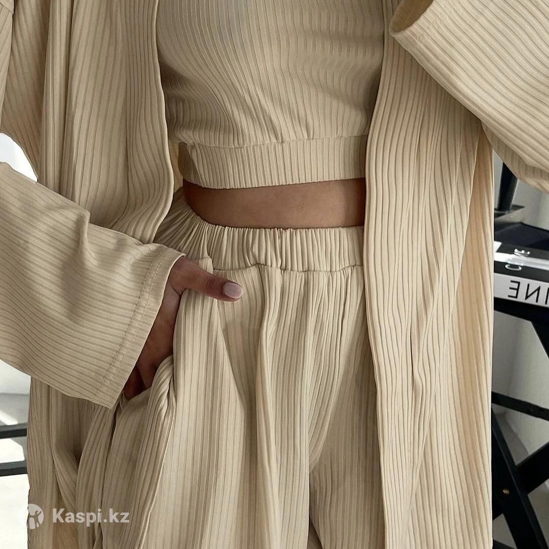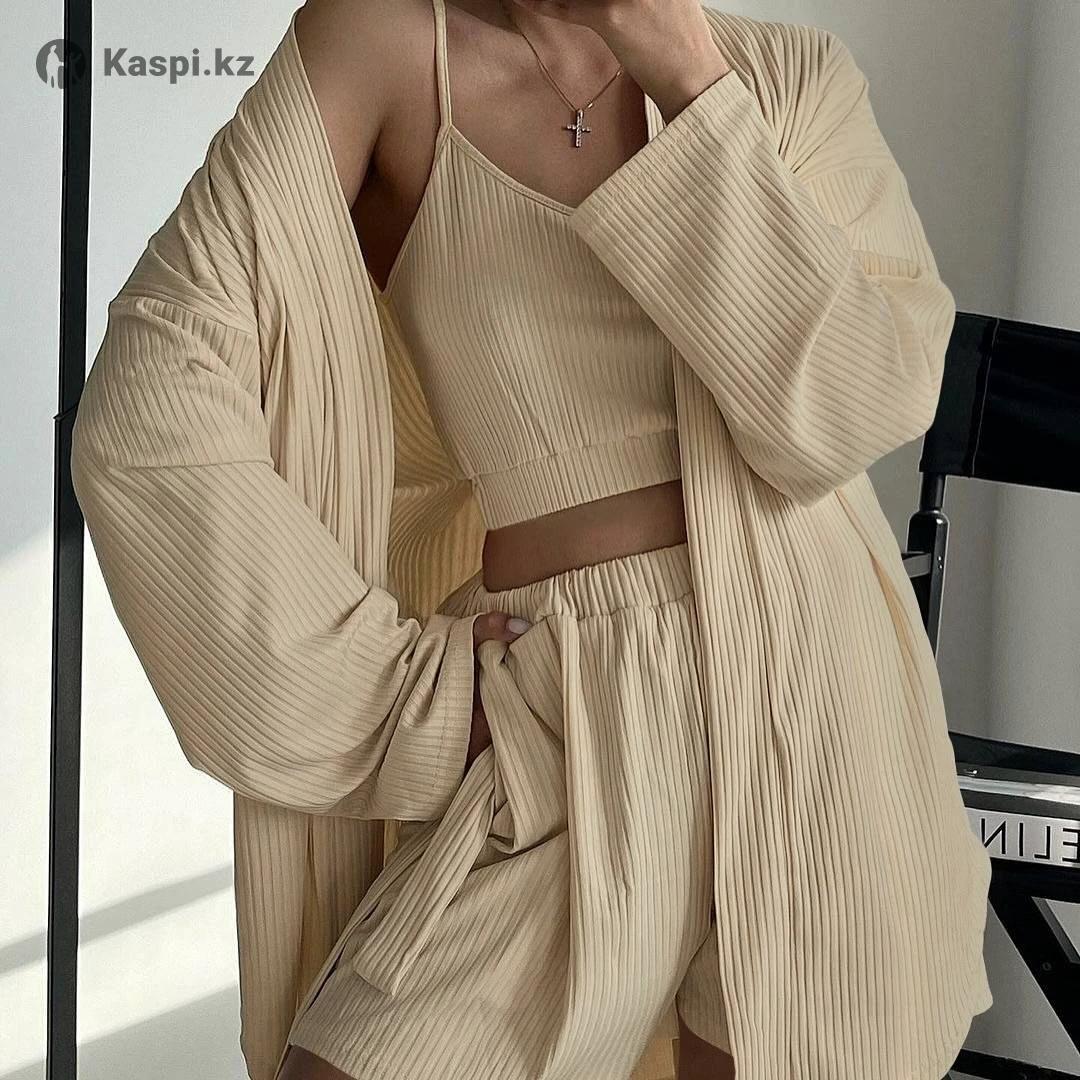 Пижама тройка - это базовый комплект для женщин, в который входит топ, шорты, халат с длинным рукавом и поясом. Костюм выполнен из приятной к телу ткани, позволяющей коже дышать. Резинка на животе не сдавливает. Высокая посадка подчеркивает талию и удлиняет силуэт. Размеры: S, M, L Самовывоз в Астане или могу отправить через такси.