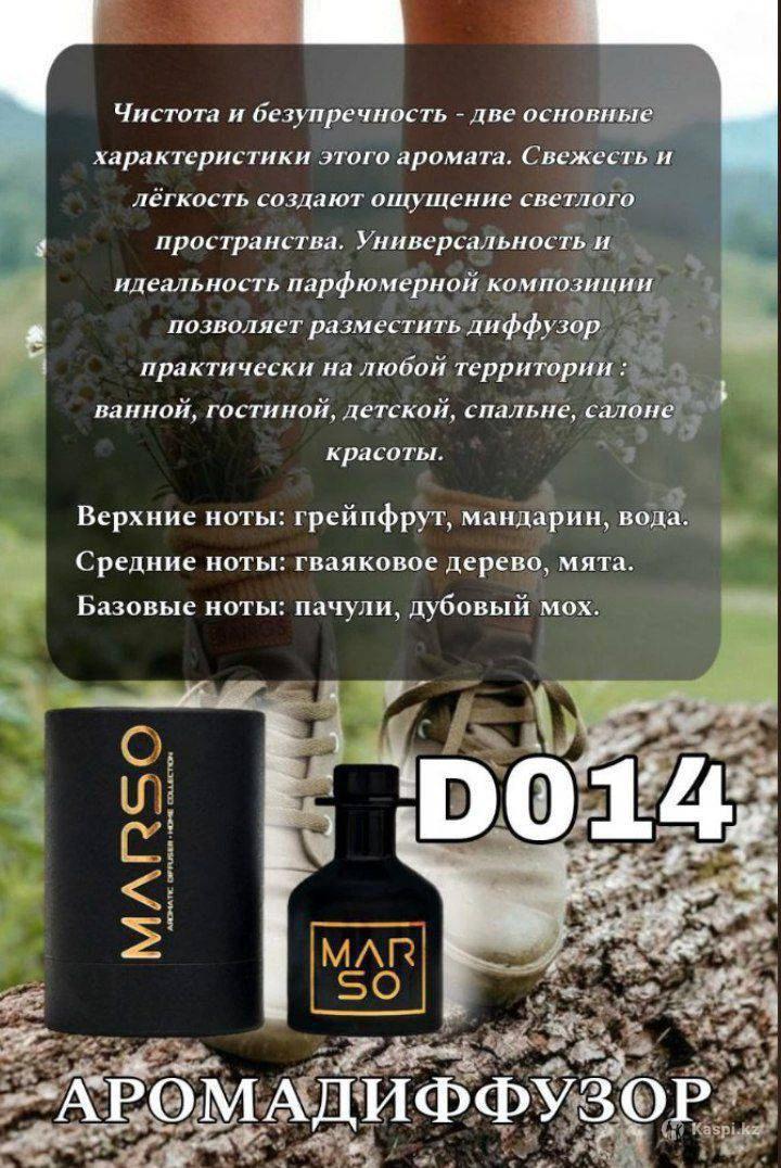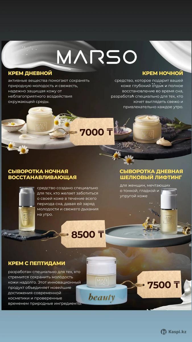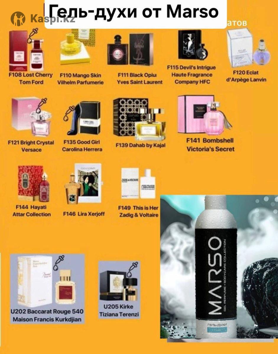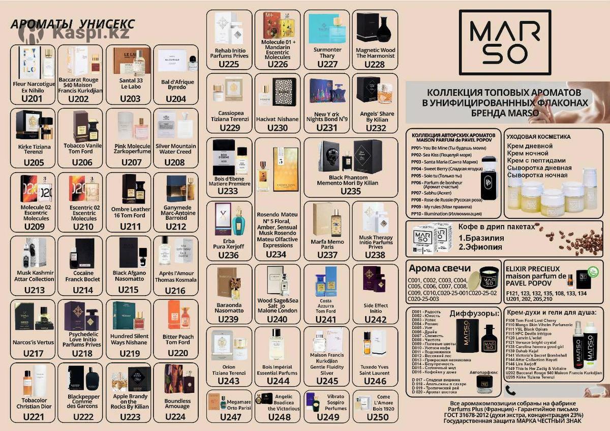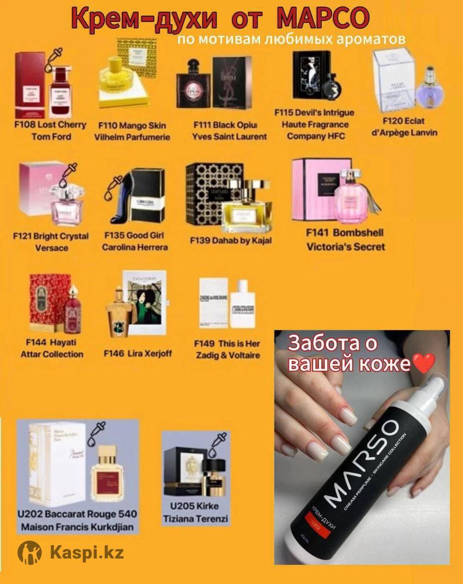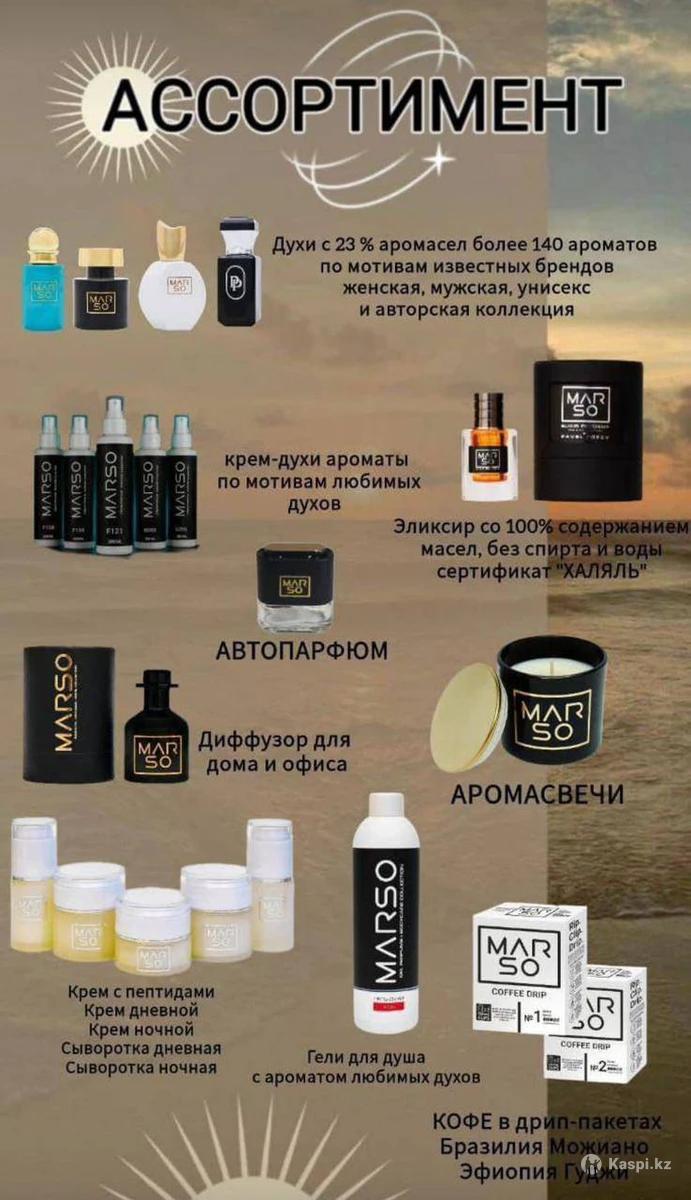 Компания Marso(это французская фирма,отличного качества,стойкость до 12ч. Имеет 23%эссенции ,что дает ей право считаться элитной). Предлагает широкий ассортимент парфюма,кремов(для лица,тела),аромадиффузоров,автопарфюма,кремов,гелей,шампуней. Также в наличии есть мусульманские духи(эликсиры без спирта). Цены: Крема-духи(200мл.) цена7000тг. Гели-духи (300мл.) цена 5000тг. Крема,сыворотки для лица(прайс в фото) Парфюм 30мл.классика,мужские, 17000тг. Аромадиффузоры 20000тг. Эликсиры 5мл.(мусульманские духи) от 35000тг. Авто парфюм 5мл. 8500тг. Шампуни, бальзамы для головы(250мл.) цена 12500тг.