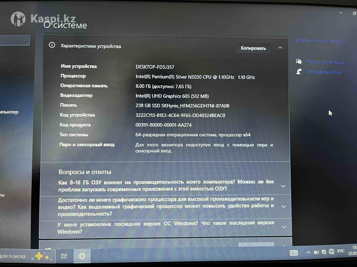 Продаю ноутбук Lenovo IdeaPad в хорошем рабочем состоянии. Использовался аккуратно, всё работает стабильно. Процессор: Intel Pentium Silver N5030 (1.10 GHz) Оперативная память: 8 ГБ DDR4 (2400 MHz) Накопитель: SSD 256 ГБ (238 ГБ доступно) Видеокарта: Intel UHD Graphics 605 (512 MB) Система: Windows 10 Pro 64-bit (22H2) Тип системы: 64-разрядная Экран: 15.6” Графика: встроенная Wi-Fi, Bluetooth: есть Камера и микрофон: есть Полностью рабочий. Есть небольшой нюанс — отсутствует одна клавиша (PgUp), на работу не влияет. В комплекте зарядное устройство. Подойдёт для: учёбы работы с документами интернета и фильмов онлайн-занятий Цена: 80000 тг