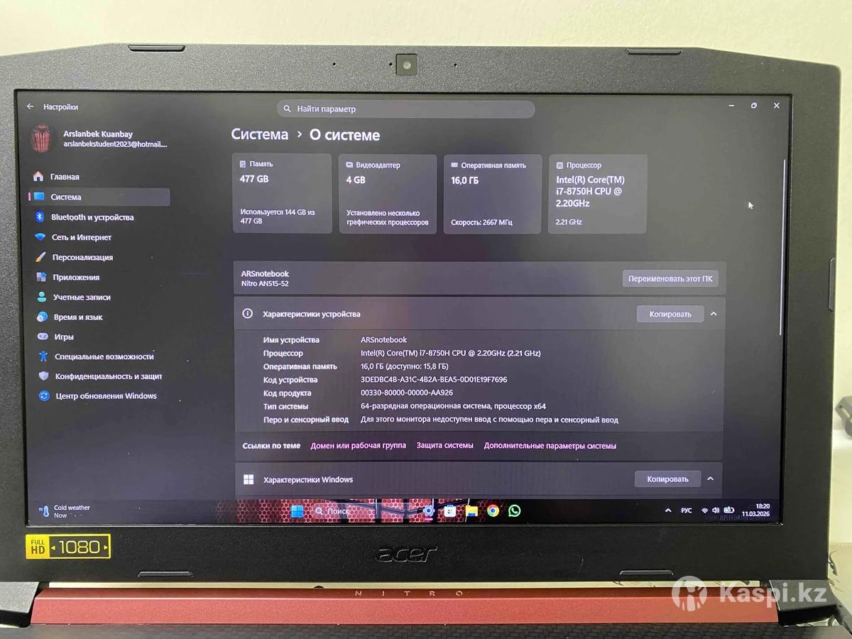 Acer nitro 5 an515-52 Intel(R) Core(TM) i7-8750H 2.21GHz ОЗУ - 16гб Nvidia Geforce Gtx 1050 память - 512гб (можно допольнительно поставить) Экран : Full HD 1920x1080 стоит Windows 11 pro внешне и внутри в очень хорошем состоянии для работы,учебы,игр самое то не лагает , не нарекает, все четко в комплекте : зарядка , мышка (logitech) , коврик и портфель для ноутбука