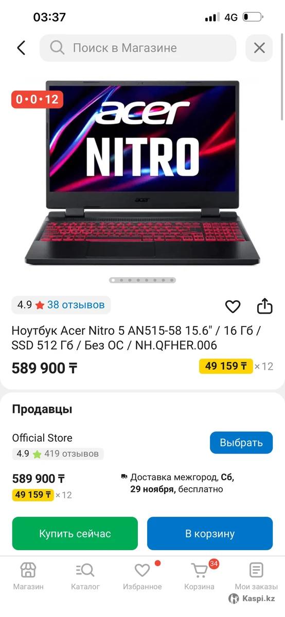 Ноутбук Acer Nitro 5 AN515-58 15.6 / 16 Гб / SSD 512 Гб / Без ОС /