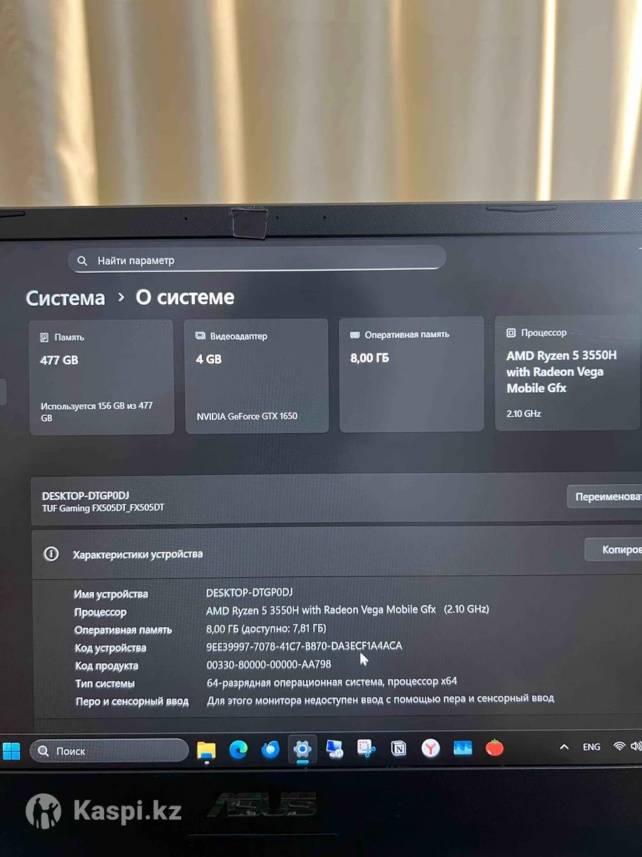 Процессор: AMD Ryzen 5 3550H with Radeon Vega Mobile Gfx (2.10 GHz) Оперативная память: 8,00 ГБ (доступно: 7,81 ГБ) Тип системы: 64-разрядная операционная система, процессор х64 Видеоадаптер: 4GB NVIDIA GeForrce GTX 1650