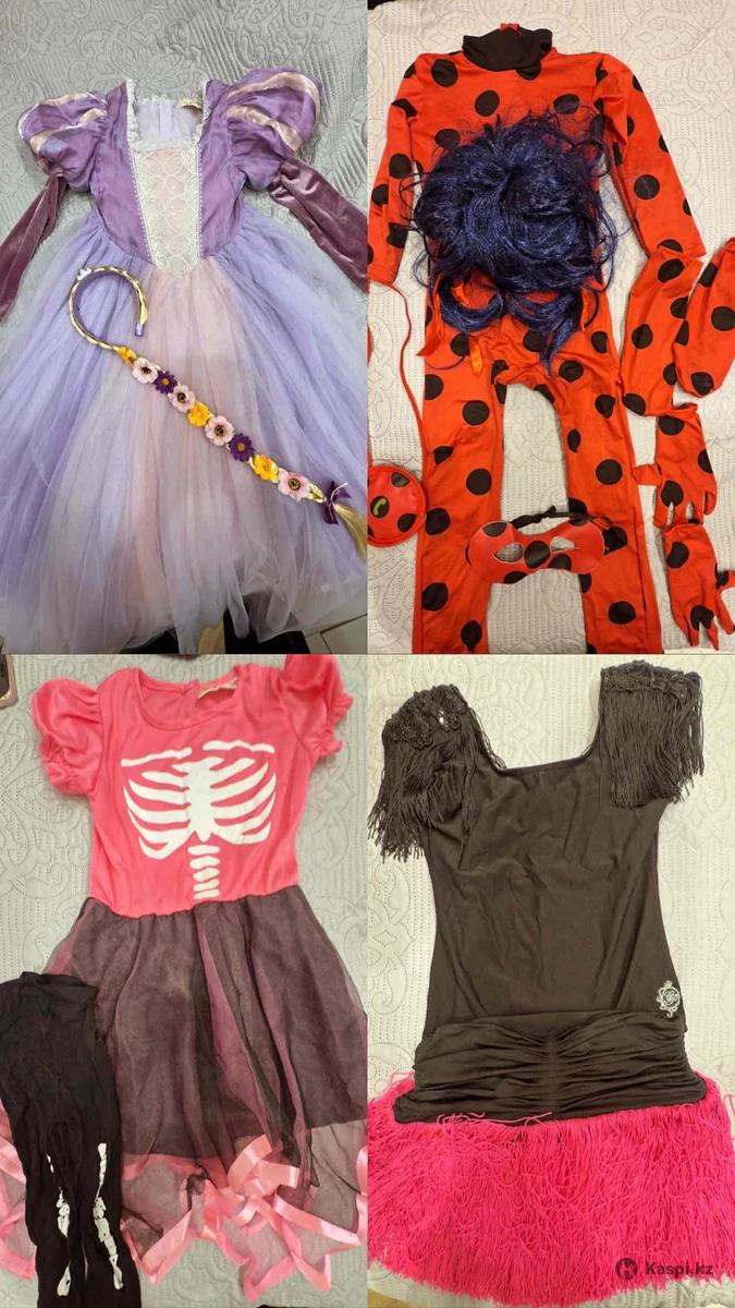 Все костюмы на возраст 5-8 лет. Платье Бальное от дизайнера Наиль Байкучуков 20000 (за 180000 покупали, сейчас стоит 230000 у дизайнера). Национальное платье и тюбетейка 20000. Рапунцель и ободок 15000 Леди баг 5000 Скелет 3000 Танцевальный костюм 5000