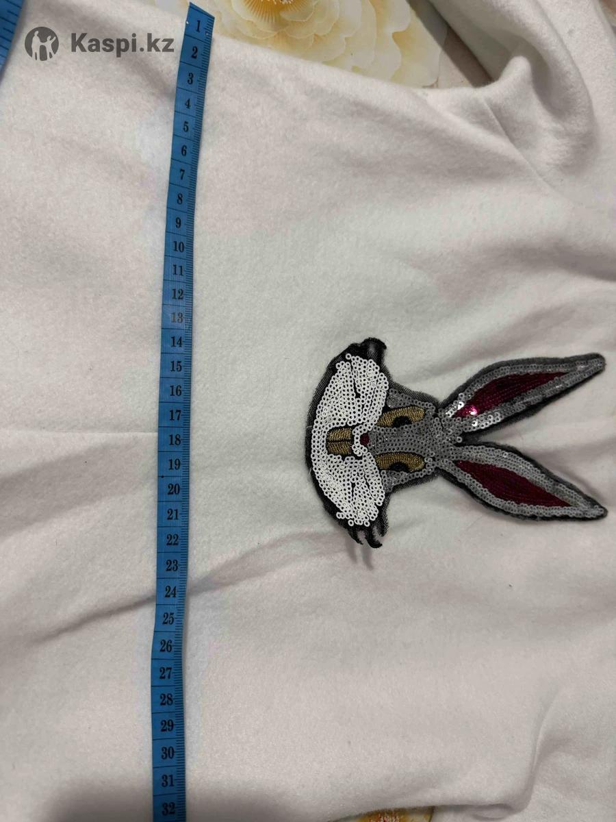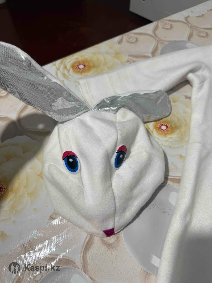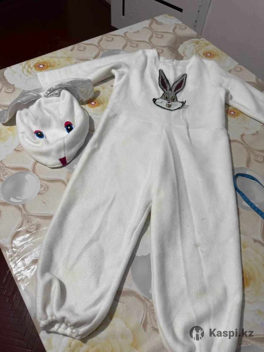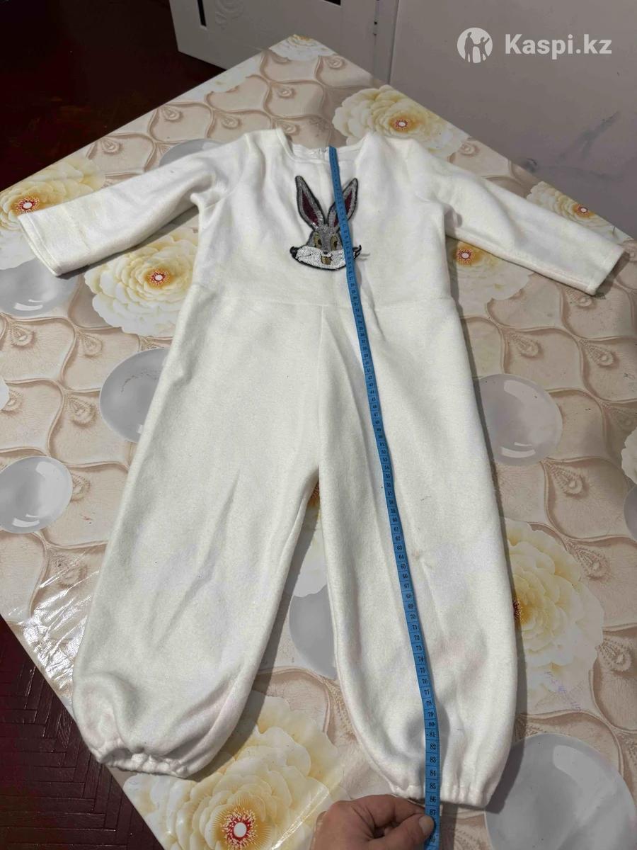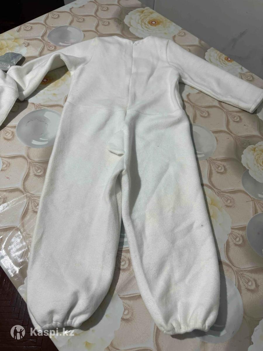 Комбинезон на молнии на спине, белый цвет , на 3 года.длинна 85 см. На рост 1 м . Подходит как для девочек так и для мальчиков.есть пришитый зайчик спереди паетками . Шапка ушки лежачие серебристые. Одевали 1 раз.