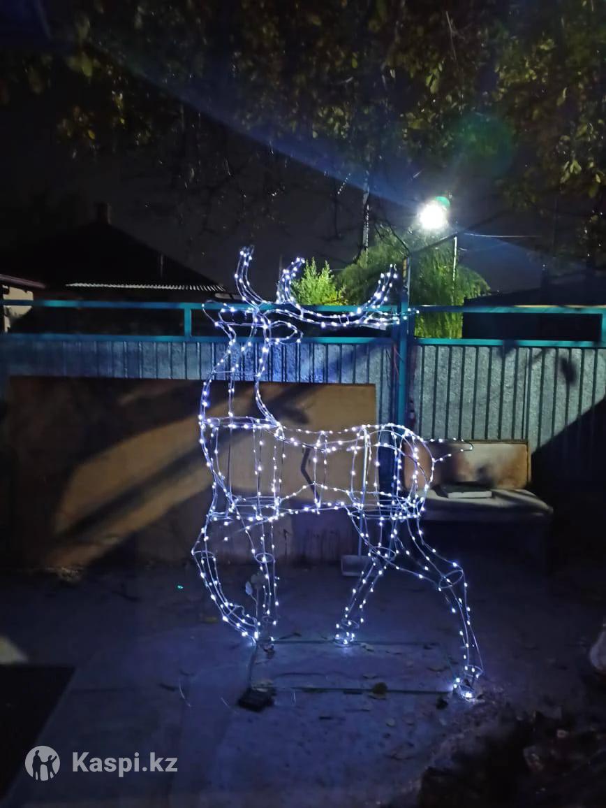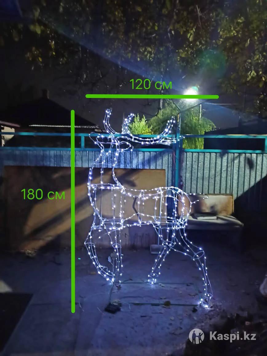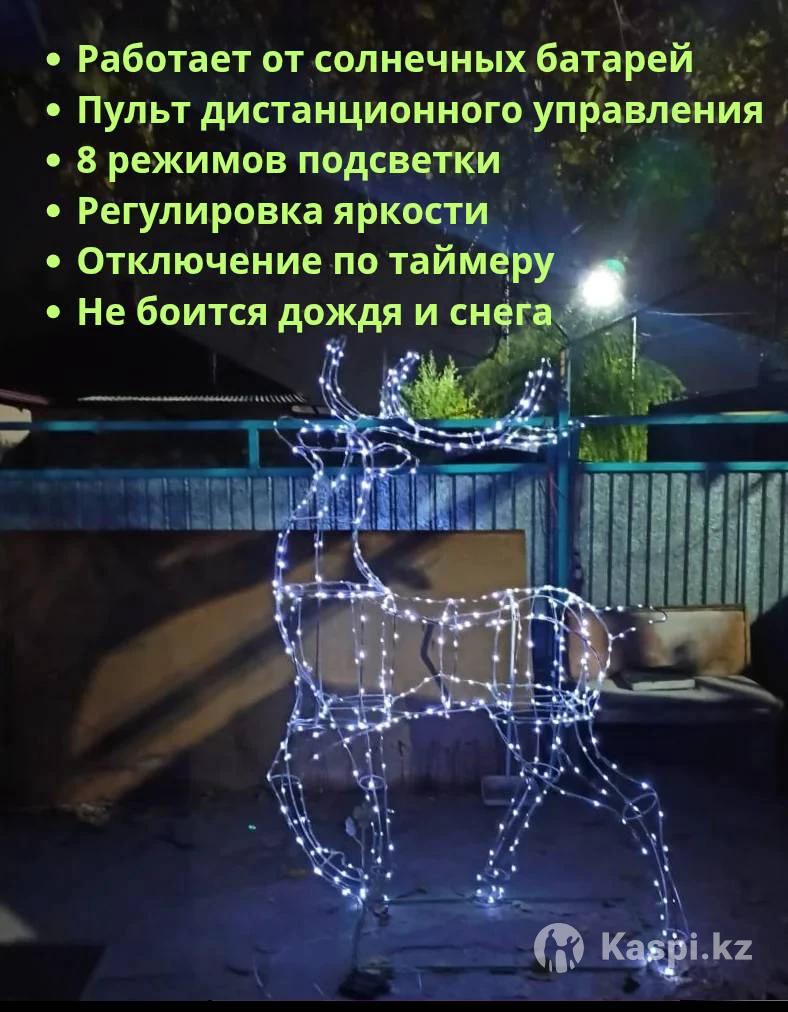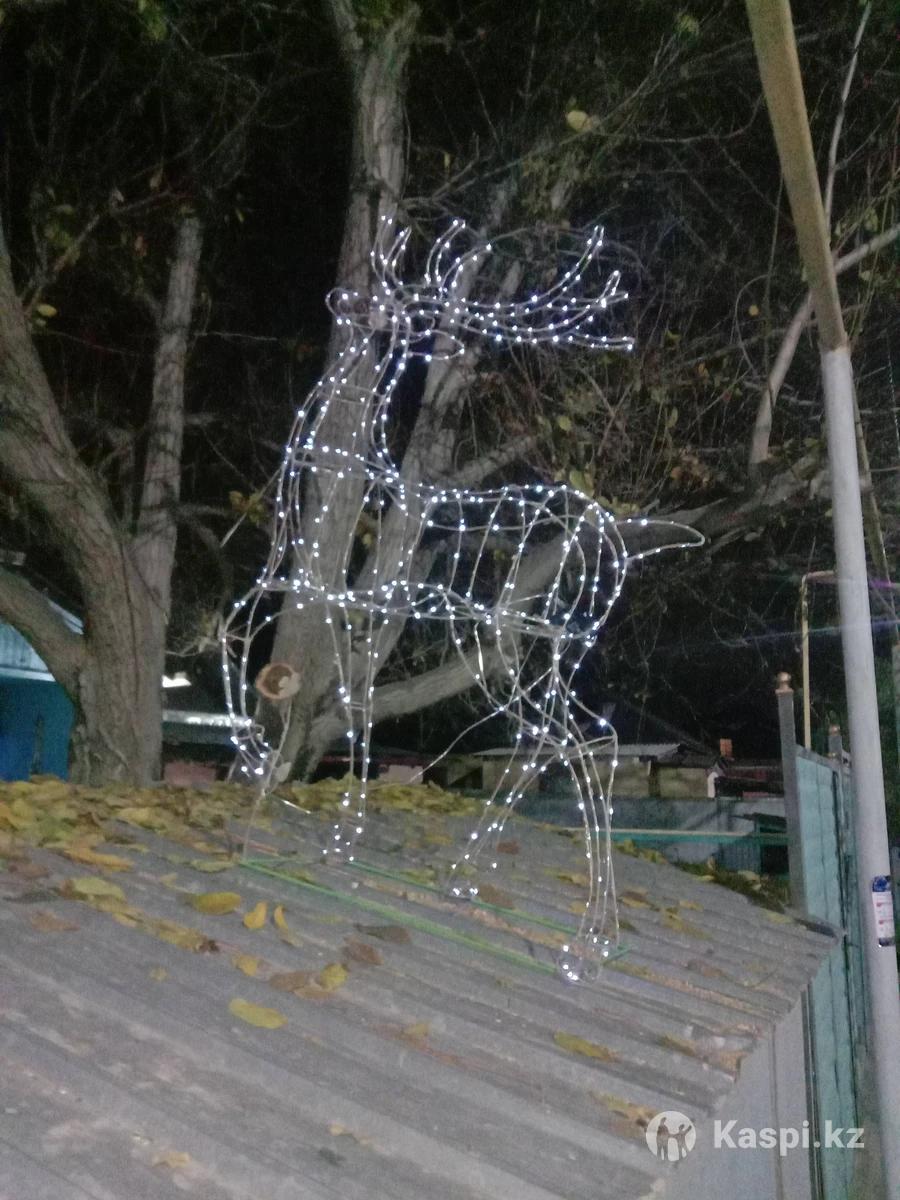 Остался один! Продается светящаяся декоративная скульптура из проволоки - НОВОГОДНИЙ ГОРДЫЙ ОЛЕНЬ. Высота - 180 см Длина - 120 см Работает от солнечной батареи. Пульт управления. 8 режимов подсветки. Регулировка яркости. Отключение по таймеру. Не боится мороза и влаги. Автоматический включается при наступлении темноты. Отличное украшение для Вашего дома, офиса, магазина. Находится в городе Талгар. Доставка по договоренности. Цена 80 000 тг.