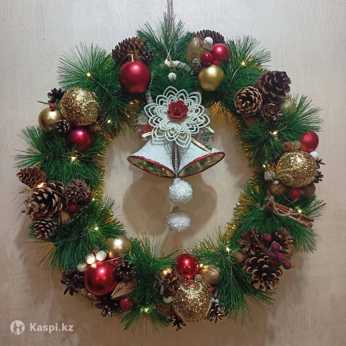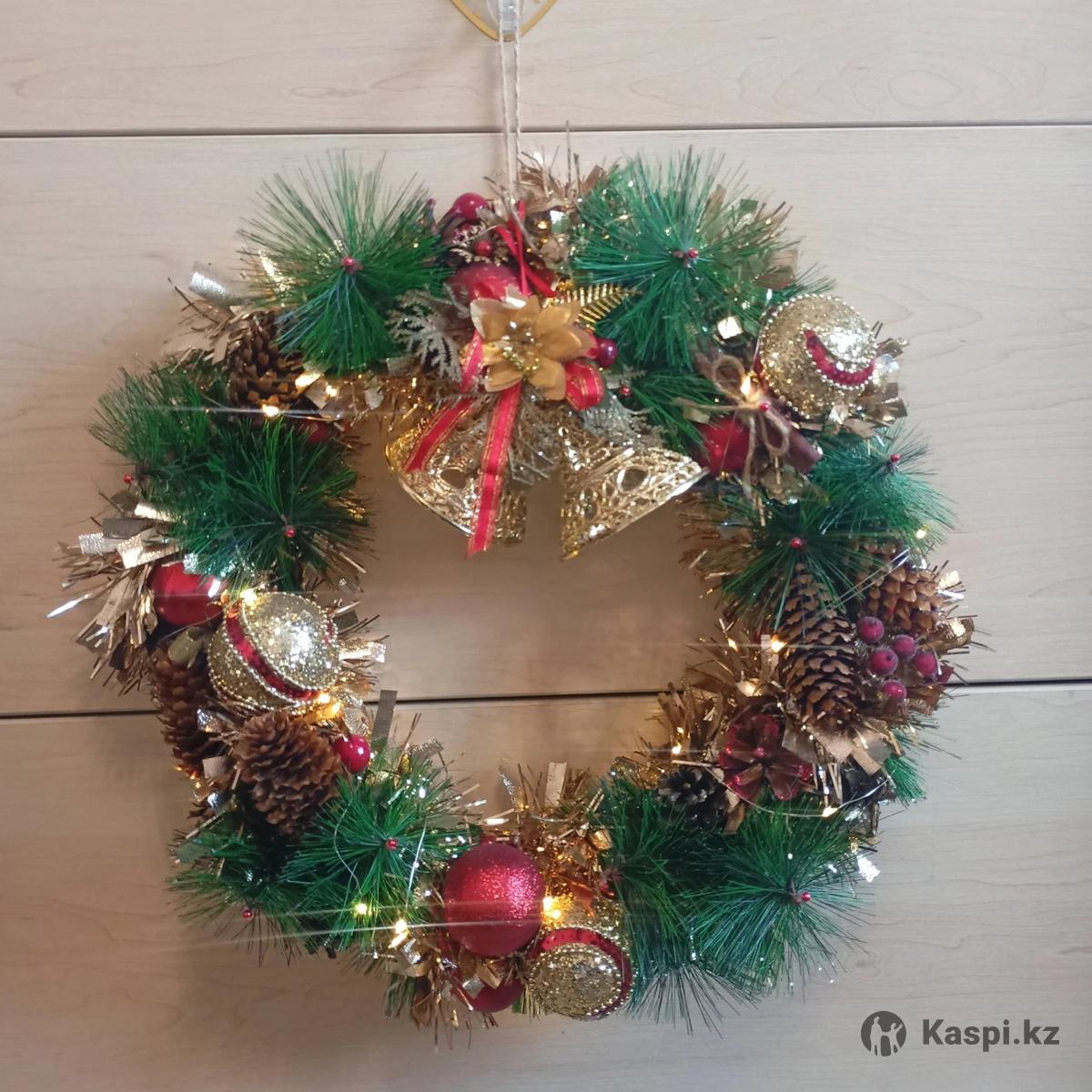 Новогодний веночек, ручная работа! Сделанный в единственном экземпляре с любовью ! .. Можно повешать на дверь, а так же, поставить на стенку, шкаф, стол. С гирляндой на батарейках. Цена 25000 тг. Есть еще варианты подарков ... Доставка курьером или самовывоз.