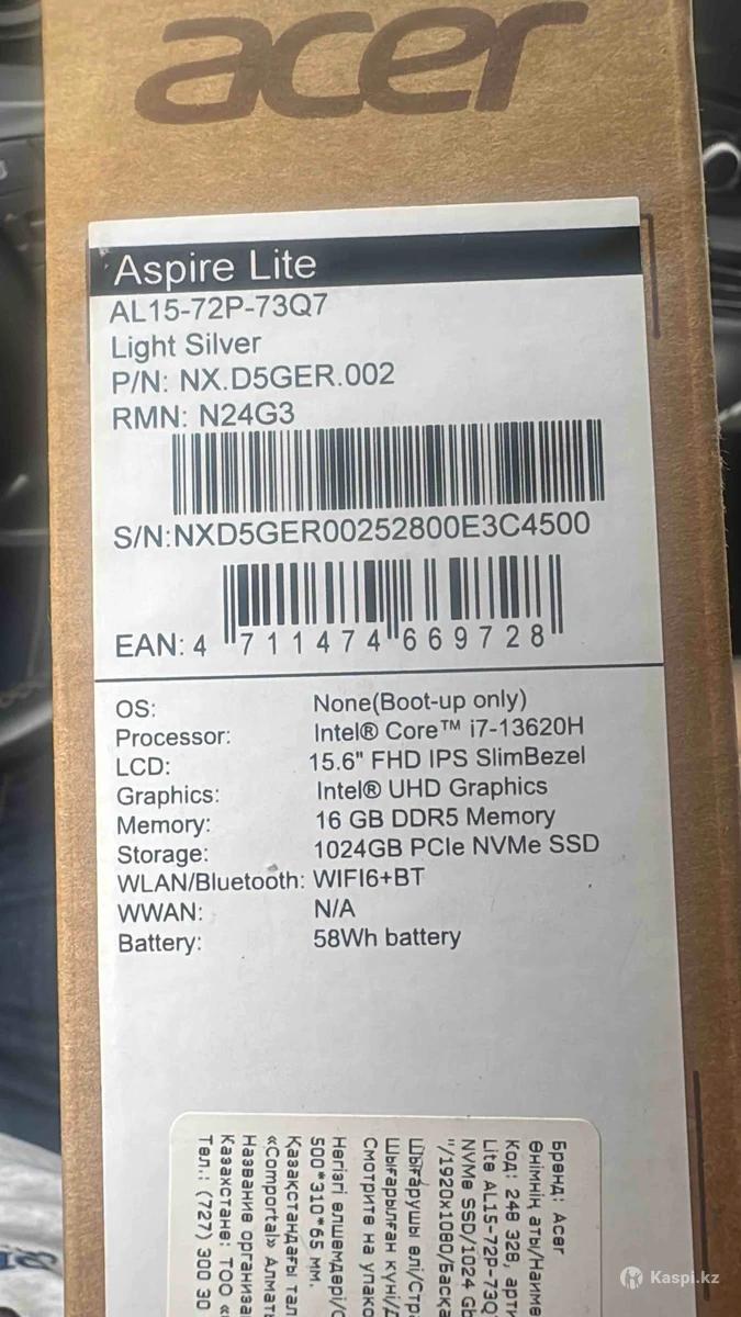 Продаю Acer Aspire Lite AL15-72P-73Q7 (Core i7 / 16GB / 1TB) Продаётся мощный и современный ноутбук Acer Aspire Lite AL15-72P-73Q7. 🔹 Процессор: Intel Core i7-13620H 🔹 Оперативная память: 16 GB DDR5 🔹 Накопитель: 1 TB NVMe SSD 🔹 Экран: 15.6” FHD IPS 🔹 Состояние: новый 🔹 Полный комплект (зарядное устройство, коробка) Куплено 420 тыс продам за 350 тыс тенге в связи деньги нужны Ноутбук работает быстро и без нареканий. Подходит для работы, учёбы, многозадачности, программ, монтажа и офисных задач.