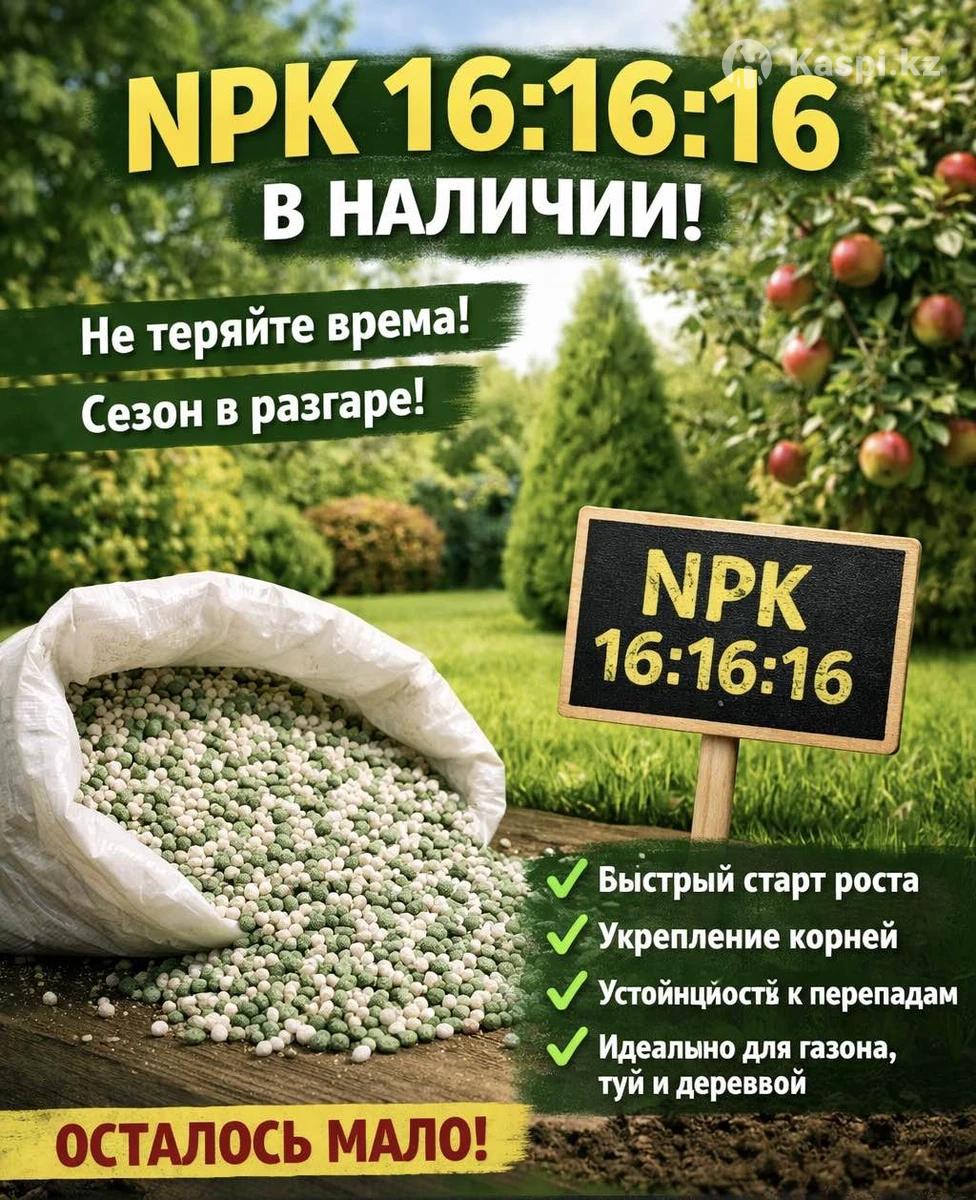 В продаже удобрение NPK 16:16:16 Универсальное минеральное удобрение для активного роста и укрепления растений. ✔️ 16% азота — для сочной зелени ✔️ 16% фосфора — для сильных корней ✔️ 16% калия — для иммунитета и устойчивости Подходит для: — газона — туй и других хвойных — декоративных кустарников — плодовых деревьев 📦 В наличии. Поможем рассчитать норму внесения под ваш участок. 📍 г. Алматы