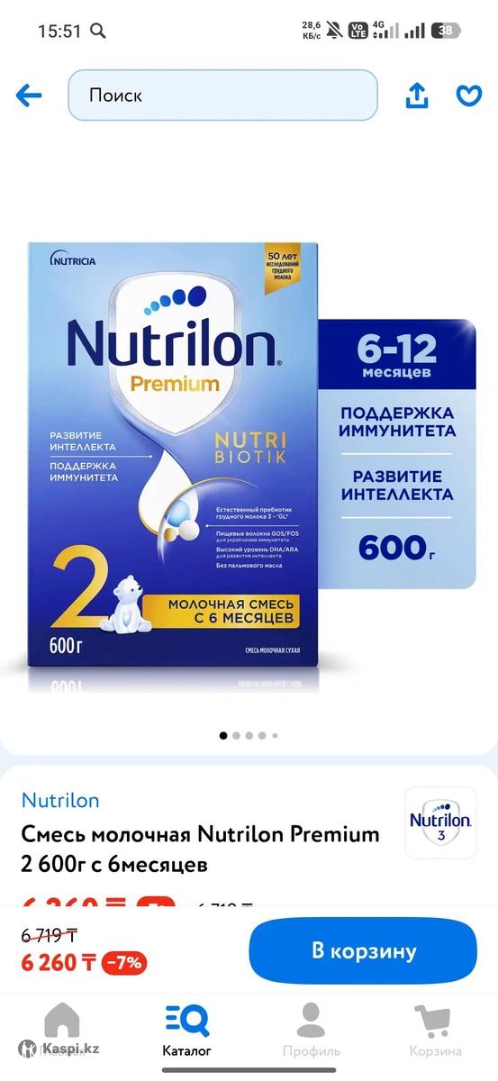 Продам смесь . Nutrilon premium 2 ( с 6 месяцев) 600 гр. Есть 4 пачки. Цена 5500 тг. Срок 21.11.2026.