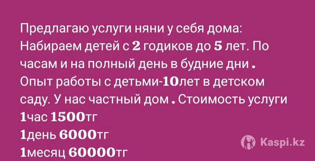 Берём детей с 2 годиков до 5 лет . Индивидуальный подход каждому к каждому ребенку. Большой опыт работы 10лет . Оплата 60000тг месяц. В день 5000тг. Выходные и праздничные дни 7000тг. Время работы с 7:30 до 18:30.Находимся в Турксибском районе ,ул . Айбасова 39 . На все остальные интересующие вопросы отвечу по телефону: