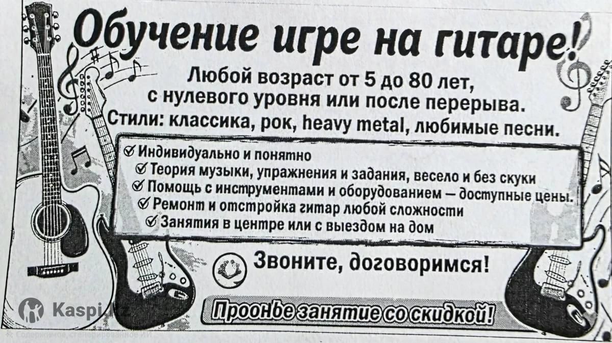 🎸 Уроки игры на гитаре для детей и взрослых — от классики до рока! 🎸 Я — Мухтар Бейсебаев. На моих занятиях вы не просто учитесь играть, а начинаете понимать музыку. Мы разбираем: 🔹 Классическую и рок-музыку 🔹 Блюз, авторские песни 🔹 Основы теории музыки (аккорды, ритм, гармония) 🔹 Подбор песен на слух и создание своих мелодий Я объясняю теорию музыки просто и понятно — вы сразу применяете знания на практике! Учимся играть то, что нравится именно вам. 🔸 Индивидуальный подход 🔸 Для любого возраста и уровня 🔸 От простых мелодий до сложных произведений 🔸 Легкая, живая подача без скуки Стоимость занятий: 1 час — 4000тг 2 часа — 7000тг 3 часа — 10 000тг Можно со своей гитарой или на моих есть все для любого жанра Это не просто уроки — это свобода понимать и чувствовать музыку! 📩 Запись в личные сообщения! Обучение игре на гитаре для начинающих. От классики до heavy metal Вам 10 или 60 лет, и вы хотите научится играть на гитаре? Все от основ: Посадки, правой левой руки, все бои переборы песни мелодии композиции, основы сольфеджио, теория музыки. Привью желание играть. Помощь в покупке инструмента. Мастерская доводка. Удобное время. 1 час 4000 1.5 часа 5000 В месяц 35000 БЕСПЛАТНАЯ КОНСУЛЬТАЦИЯ.