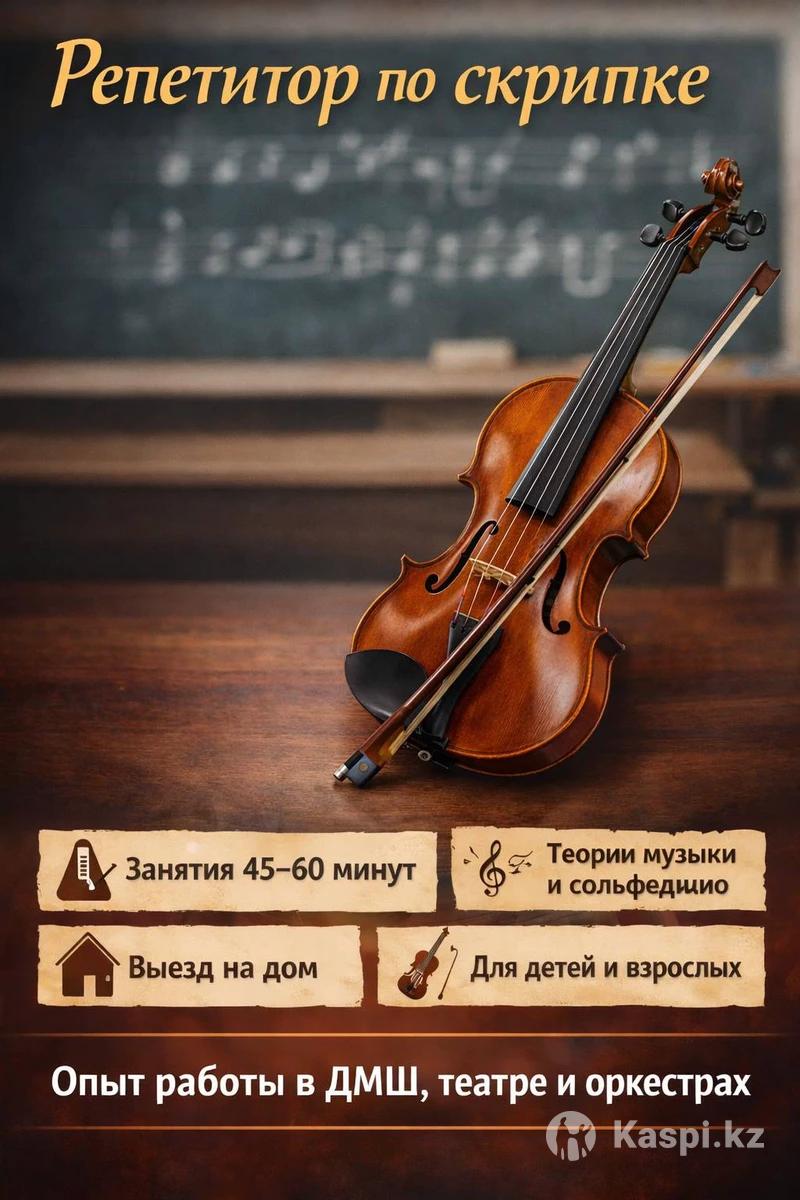 Скрипкадан репетитор (балалар мен ересектер үшін). Жеке сабақтар 45–60 минут: қол қою техникасы, есту қабілетін дамыту, музыка теориясы және сольфеджио. Бастапқы деңгейден бастап жалғастырушы оқушылармен жұмыс істеймін. Үйге барып сабақ өткіземін. Өзім жайлы: Жоғары музыкалық білім. Балалар музыка мектебінде, театрда, симфониялық және эстрадалық-симфониялық оркестрлерде, камералық ансамбльдерде жұмыс тәжірибесі бар. Репетиторство по скрипке для детей и взрослых. Индивидуальные занятия 45–60 минут: постановка рук, развитие слуха, теория музыки и сольфеджио. Работаю с начинающими и продолжающими. Выезд на дом. О себе: Высшее музыкальное образование. Опыт работы в ДМШ, театре, симфоническом и эстрадно-симфоническом оркестрах, камерных ансамблях.